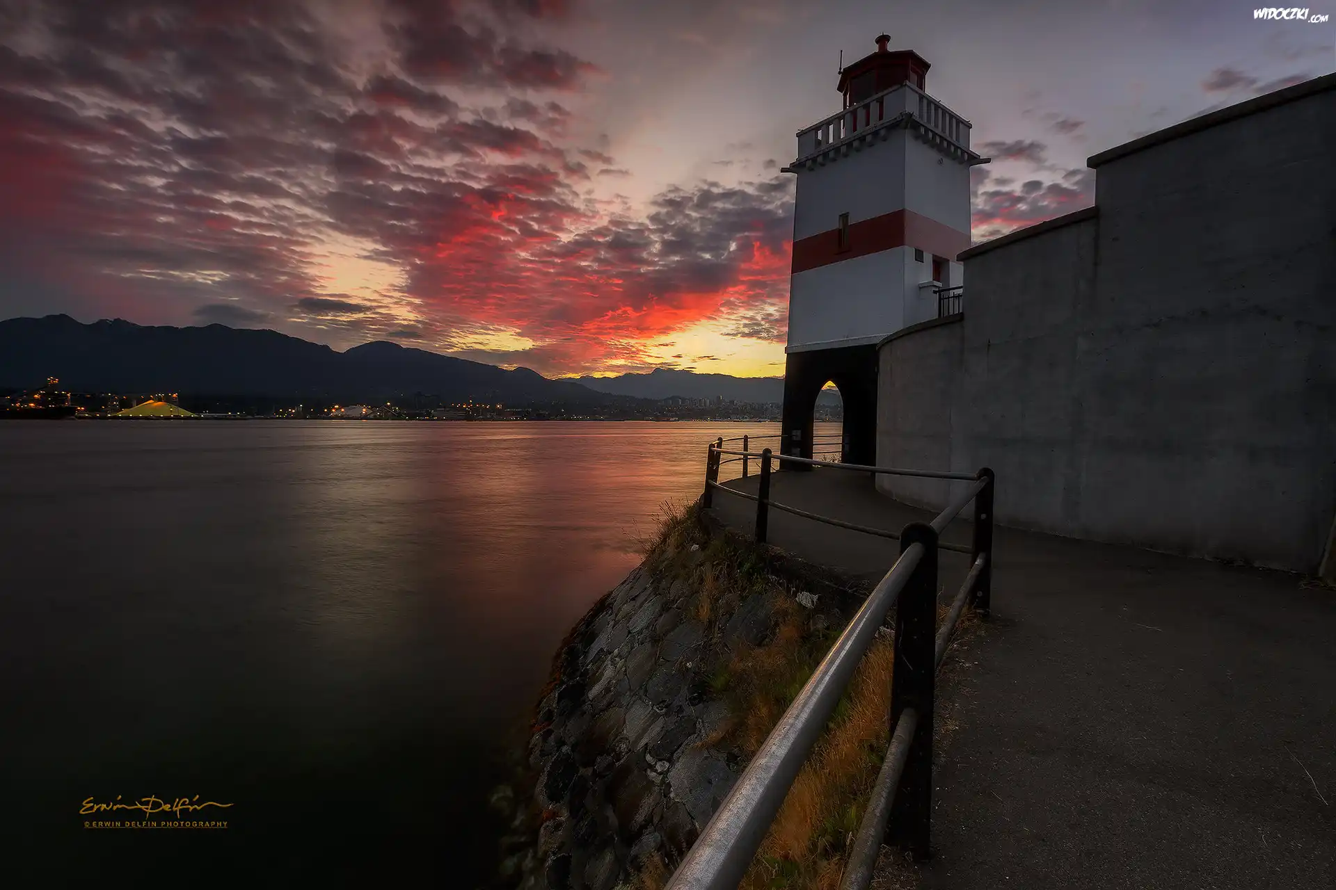 Zdjęcia, Wschód słońca, Zatoka, Morze, Latarnia morska Brockton Point, Stanley Park, Vancouver, Kanada
