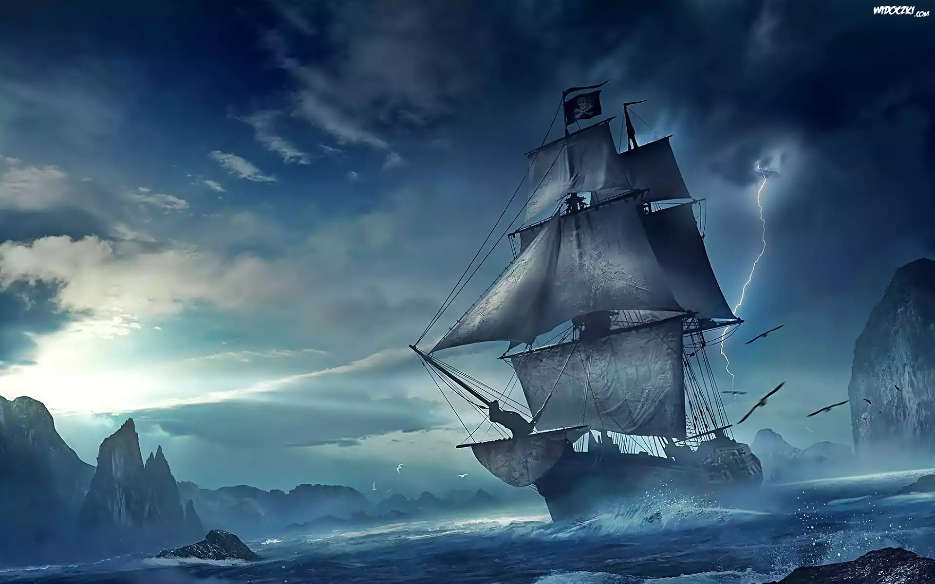Zdjęcia, Żaglowiec, Morze, Piorun