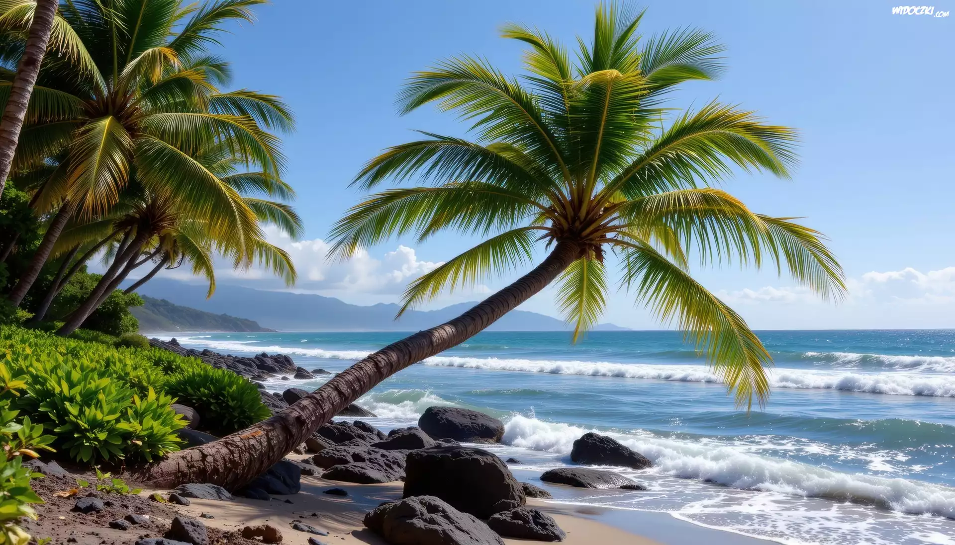 Zdjęcia, Palmy, Plaża, Kamienie, Morze, Grafika AI