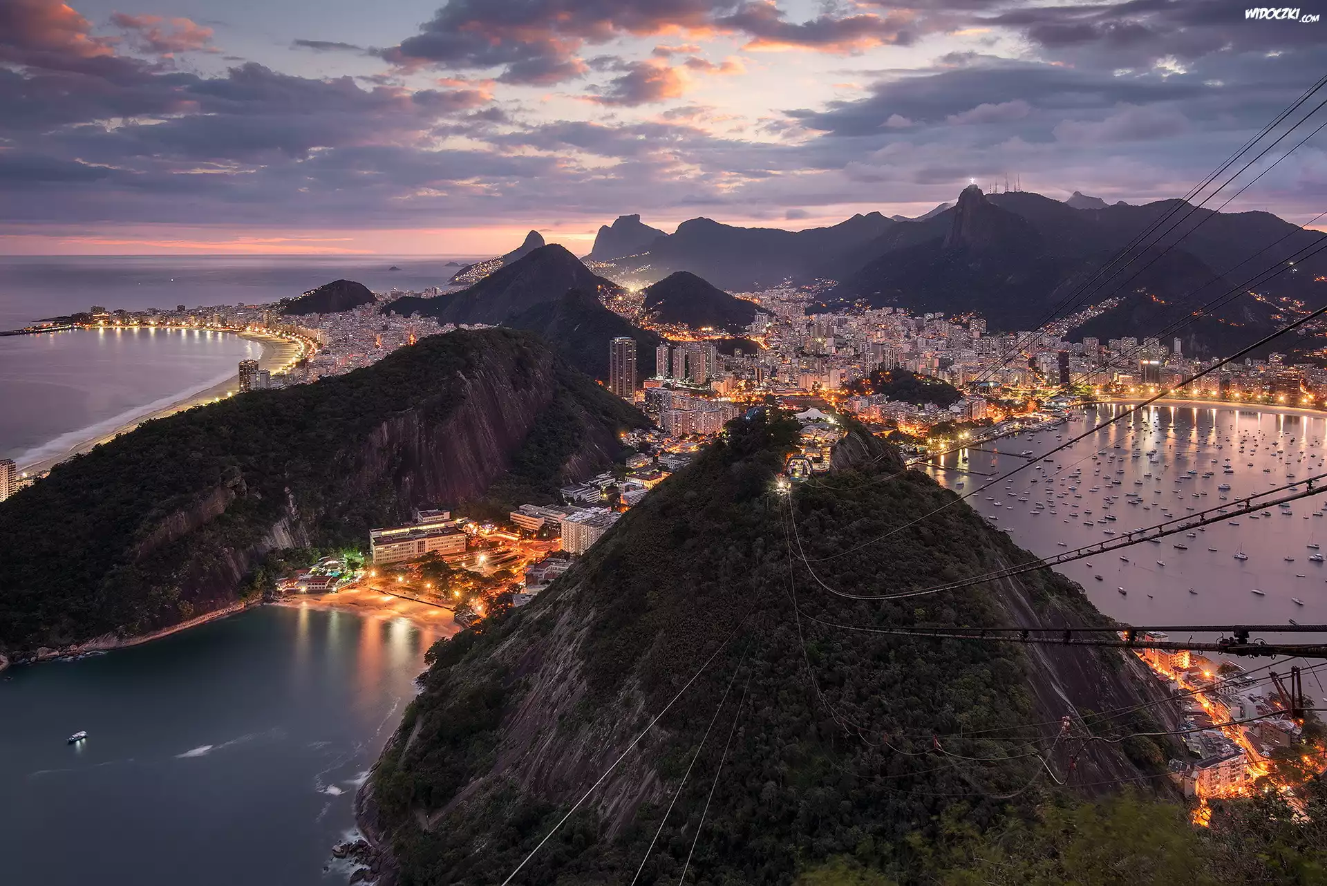 Brazylia, Rio de Janeiro, Morze, Zatoka Guanabara, Statki, Góry, Domy, Światła, Zachód słońca, Chmury |