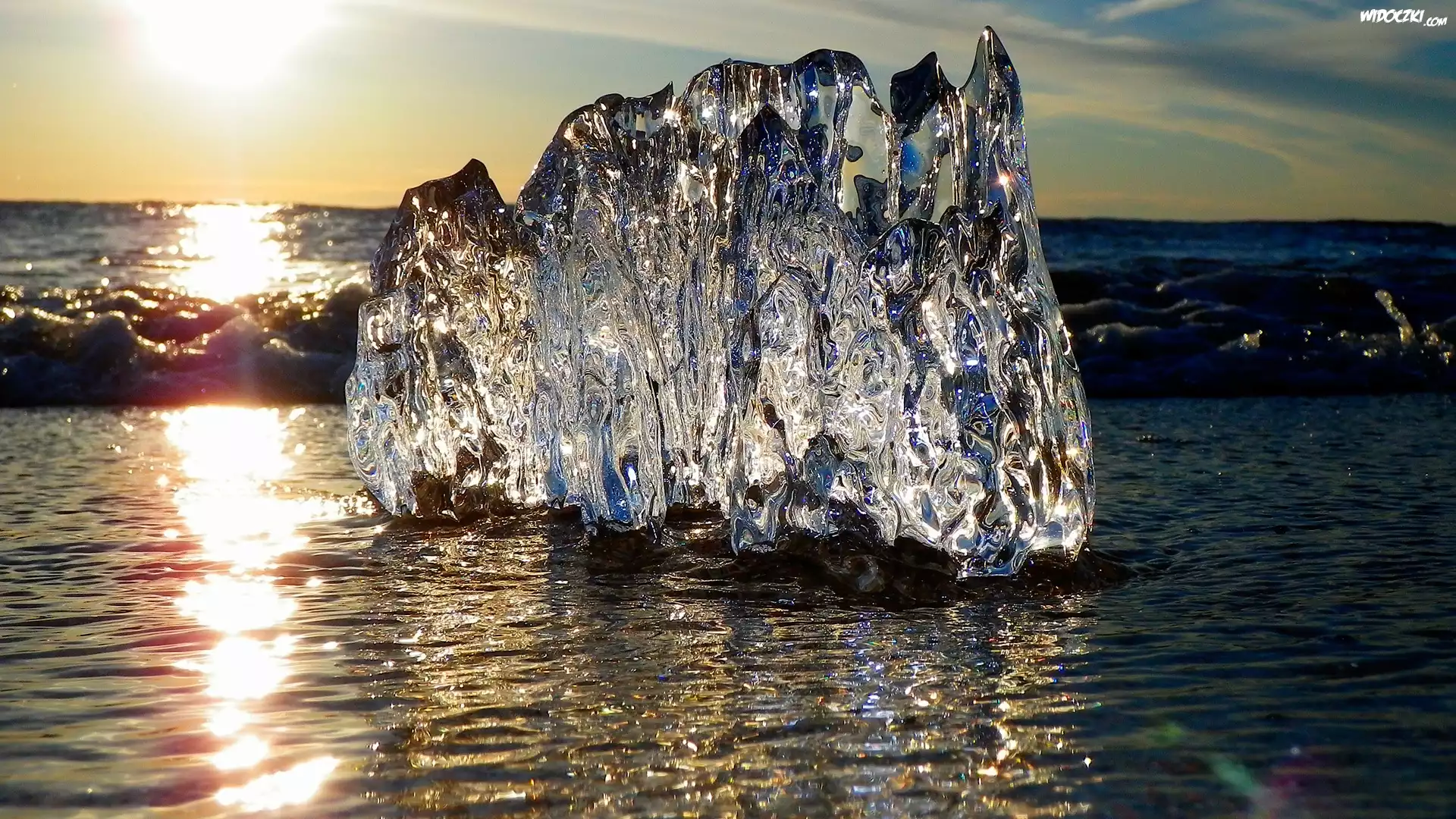 Zdjęcia, Morze, Zachód, Słońca, Odbicie, Bryła, Lodu