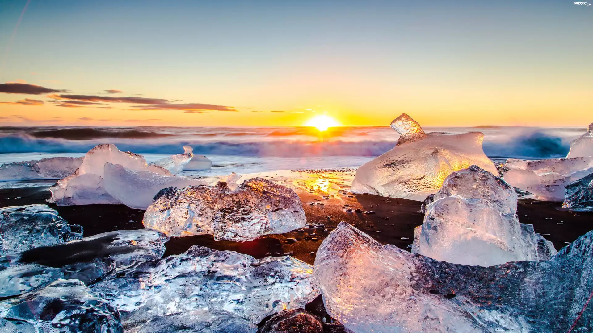 Zdjęcia, Morze, Zachód słońca, Bryły lodu