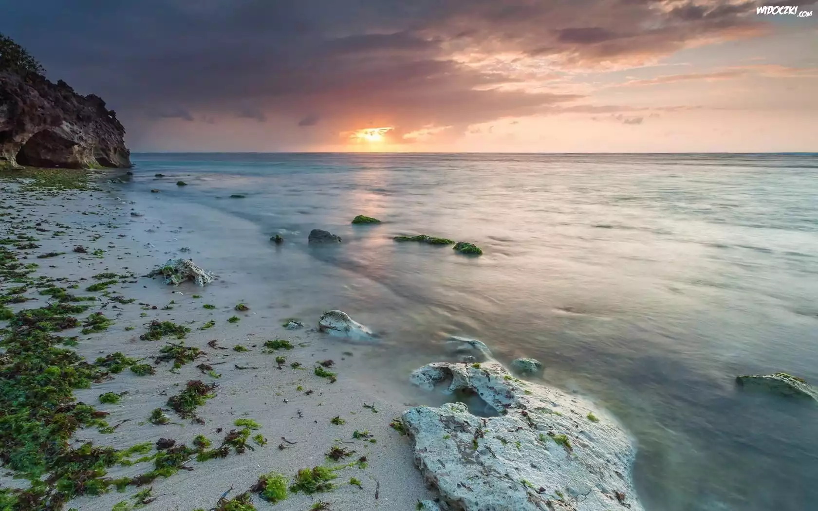 Zdjęcia, Morze, Zachód, Słońca, Brzeg, Rośliny