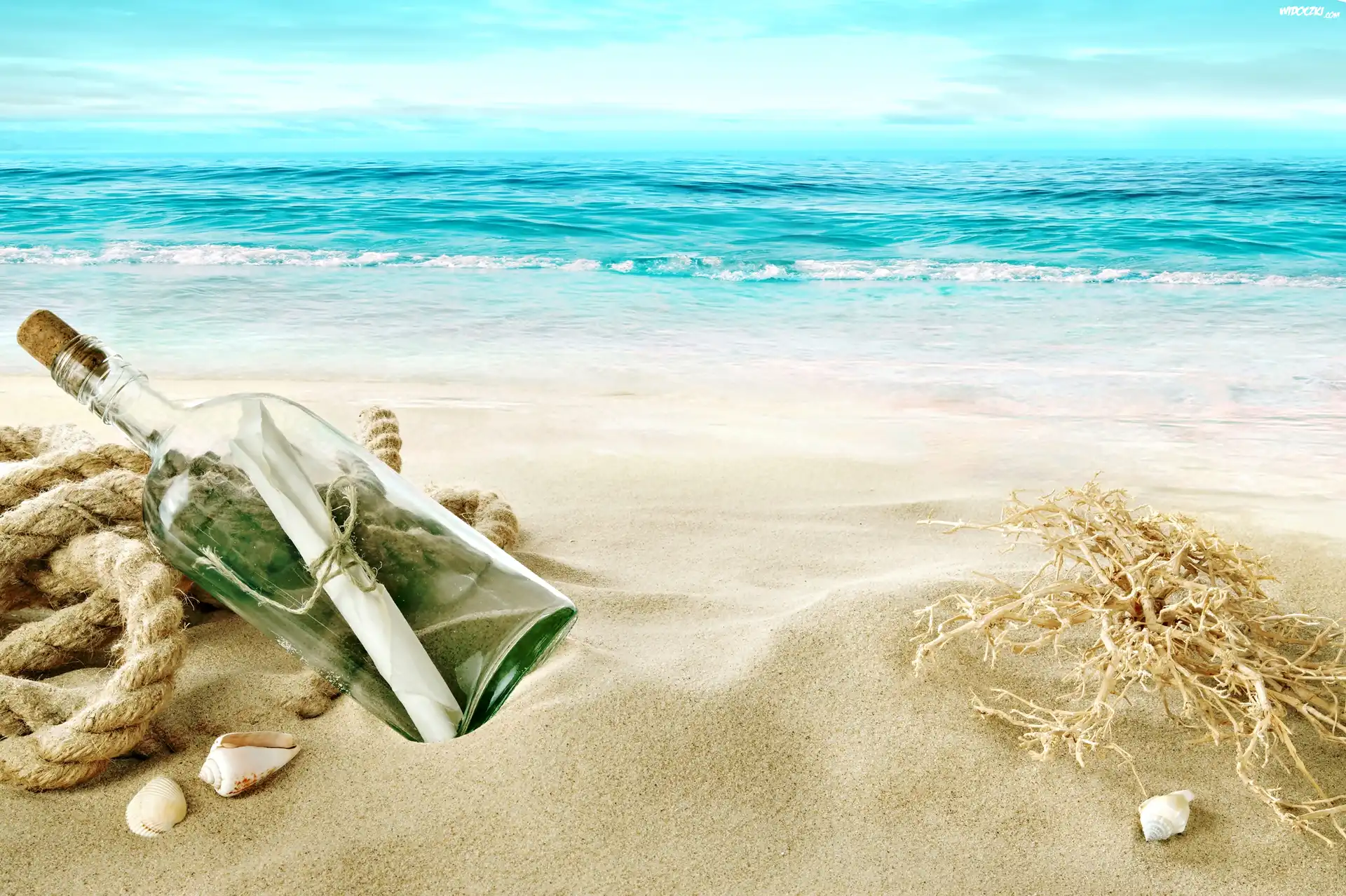 Zdjęcia, Morze, Plaża, Butelka, Muszelki