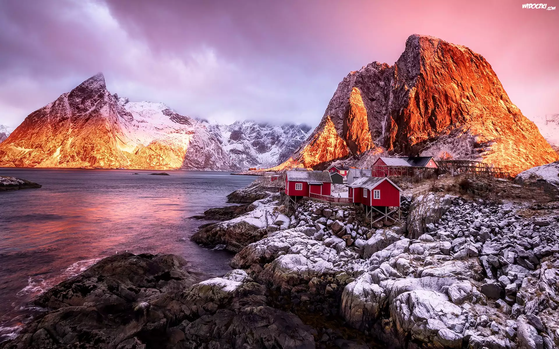 Zdjęcia, Morze Norweskie, Lofoty, Góry, Domy, Wioska Hamnoy, Skały, Chmury, Norwegia