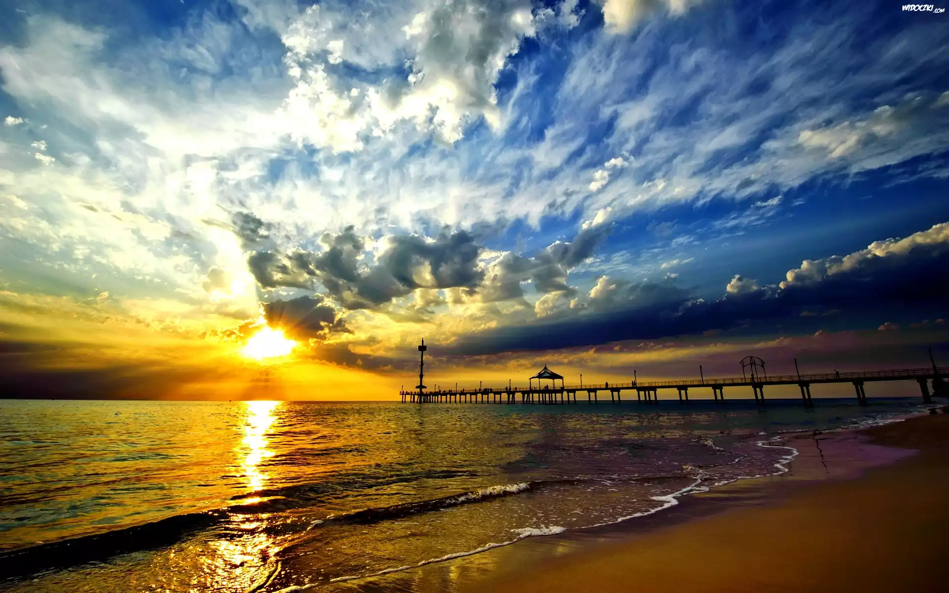 Zdjęcia, Morze, Plaża, Chmury, Pomost
