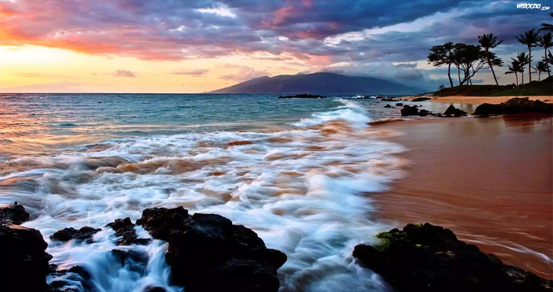 Morze, Skały, Chmury, Drzewa