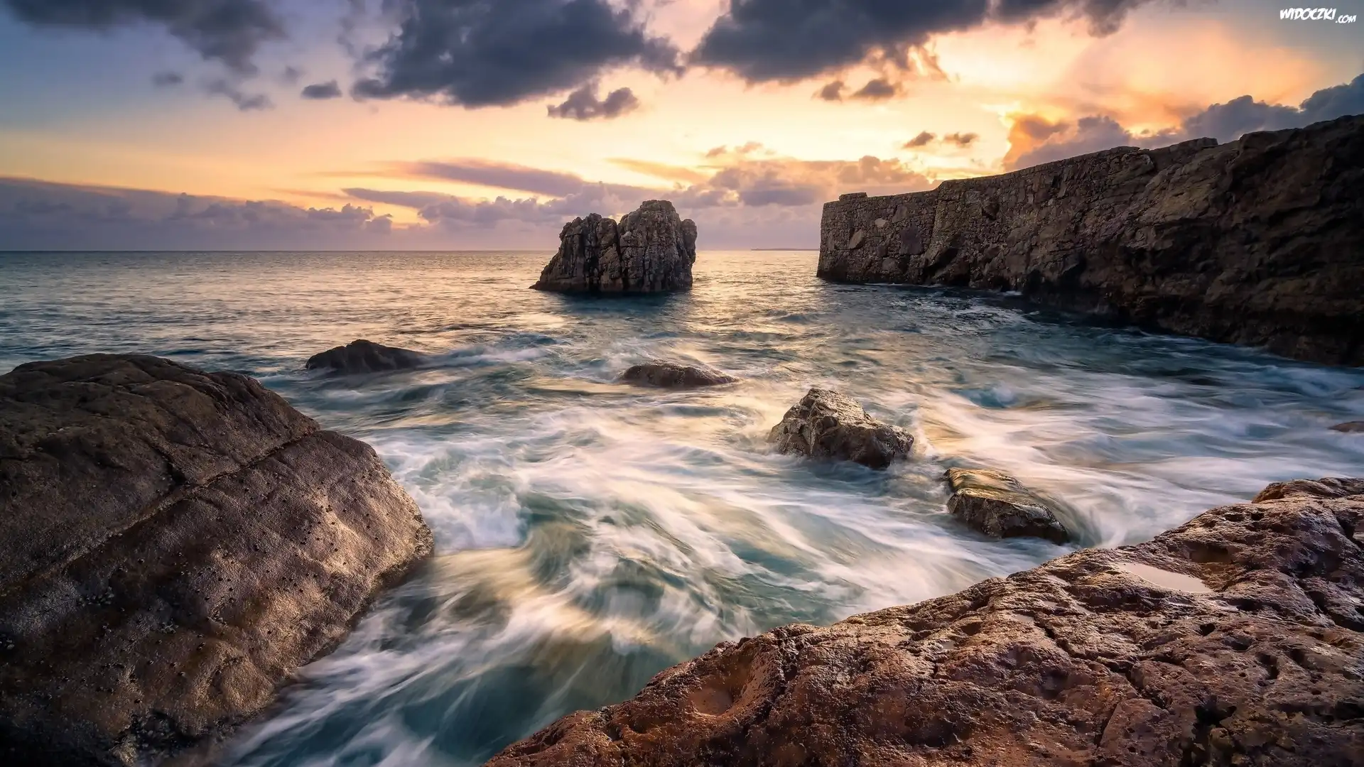 Zdjęcia, Morze, Skały, Chmury, Poranek