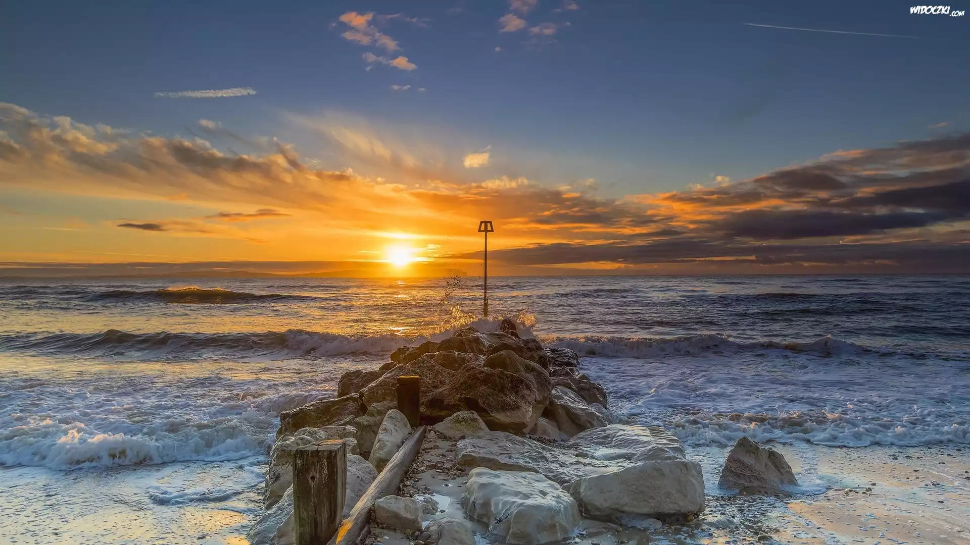Morze, Zachód słońca, Chmury, Kamienie