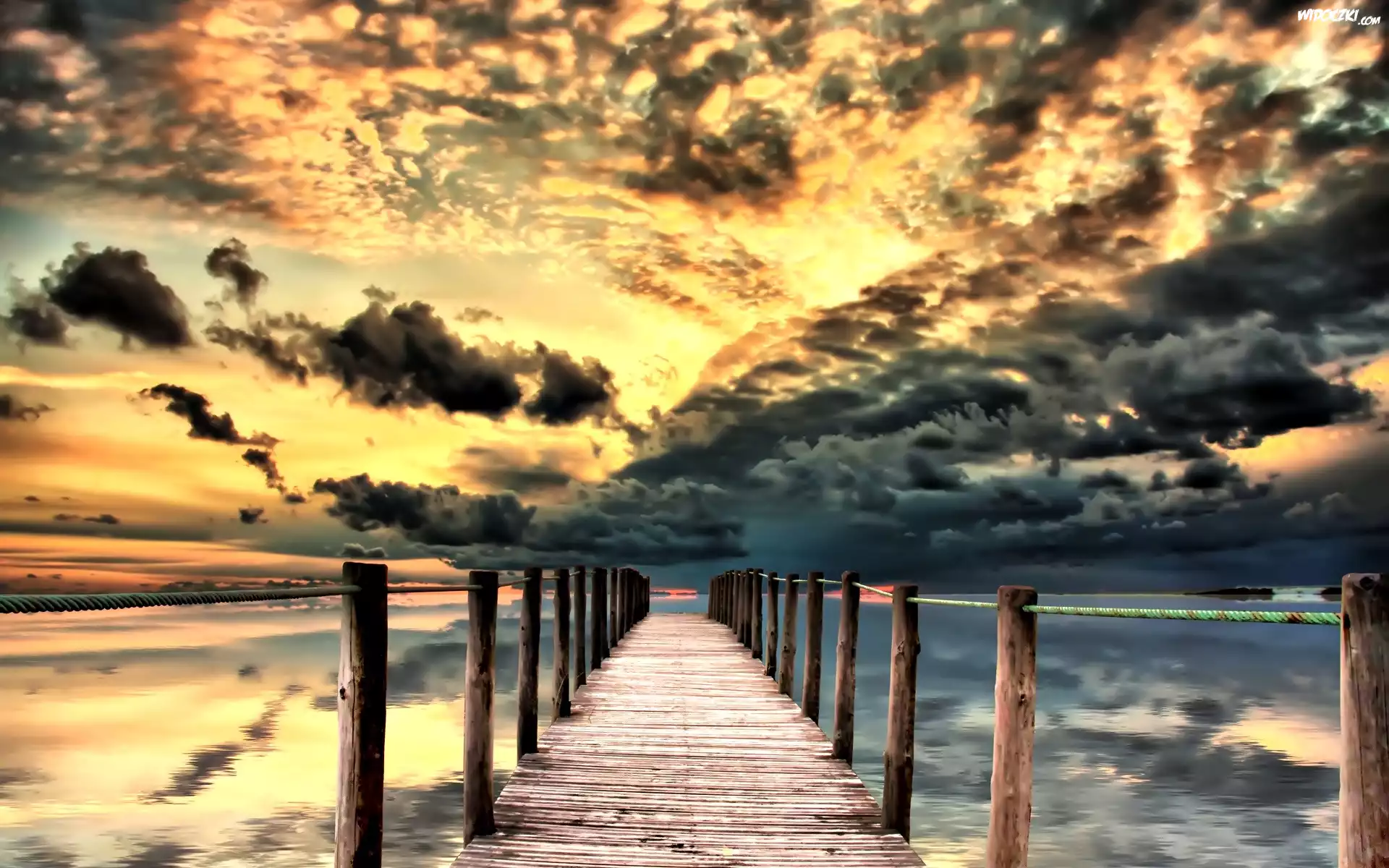 Zdjęcia, Morze, Zachód Słońca, Chmury, Molo