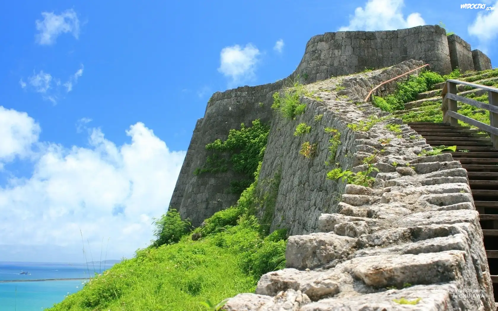 Zdjęcia, Morze, Schody, Trawa, Chmury, Niebo