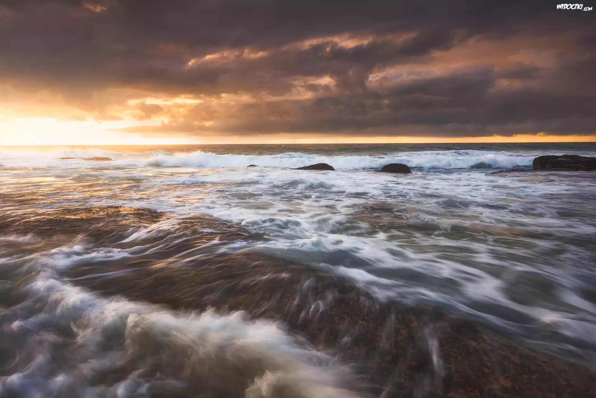 Morze, Skały, Wschód słońca, Ciemne, Chmury