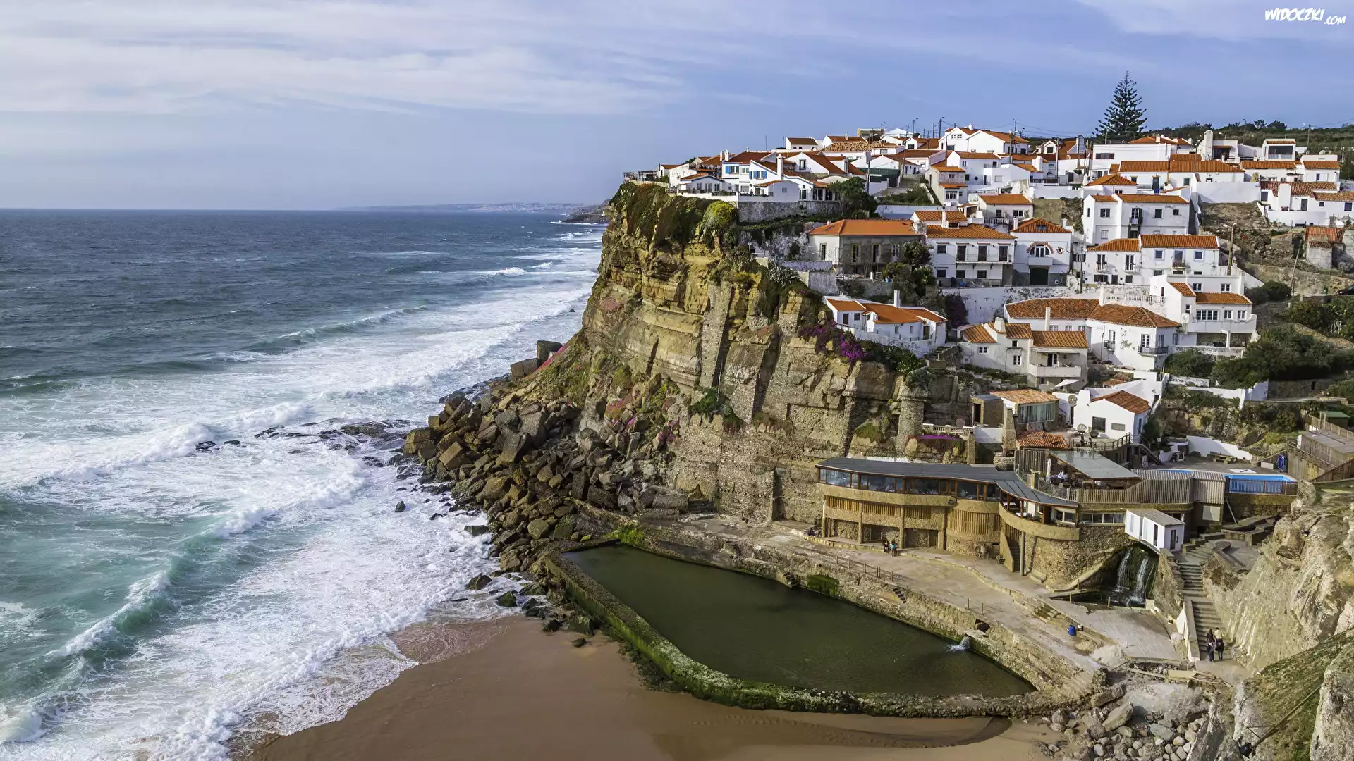 Zdjęcia, Portugalia, Wybrzeże, Miasteczko Azenhas do Mar, Klif, Skały, Domy, Morze