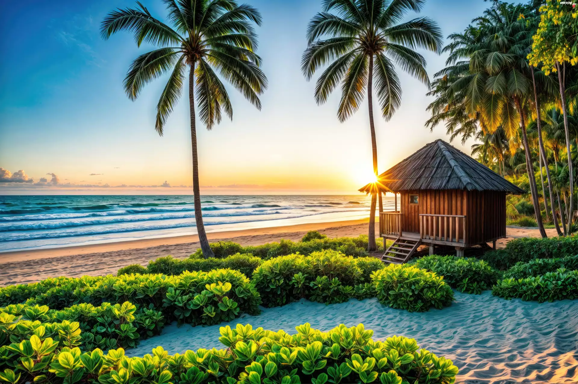 Zdjęcia, Plaża, Rośliny, Domek, Morze, Palmy, Tropiki, Grafika