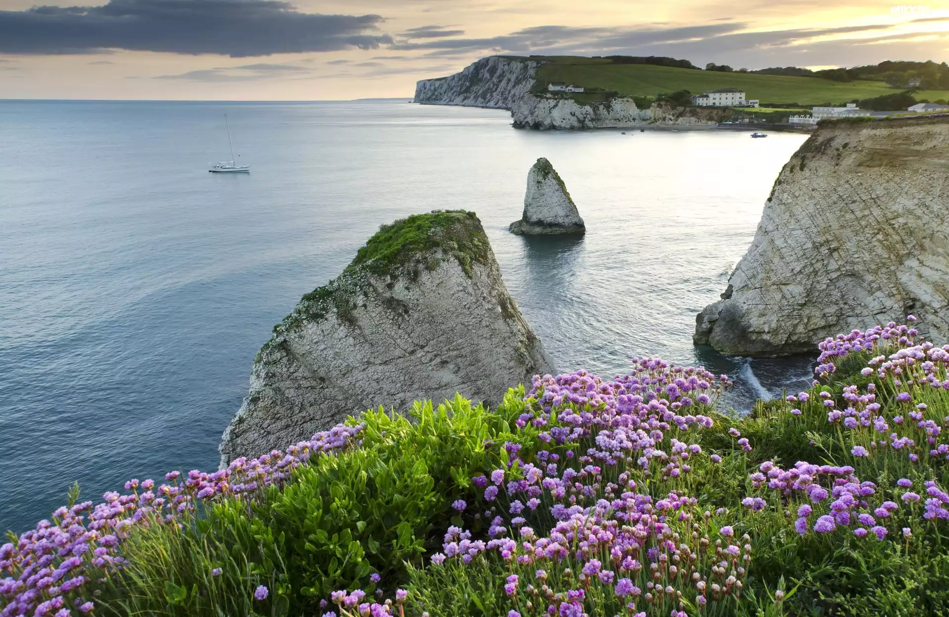 Zdjęcia, Morze, Skały, Domki, Roślinność