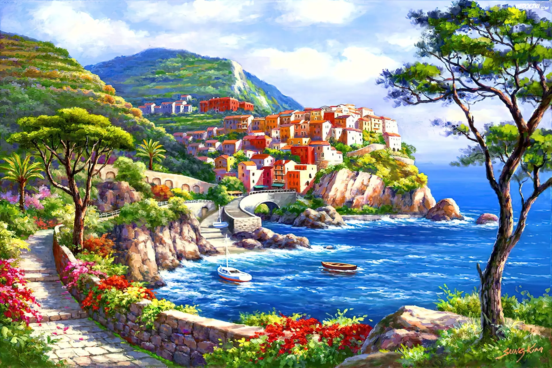 Morze, Wybrzeże, Góry, Domy, Kwiaty