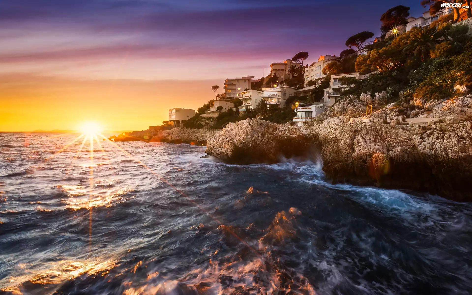 Zdjęcia, Morze, Wschód słońca, Domy, Wybrzeże
