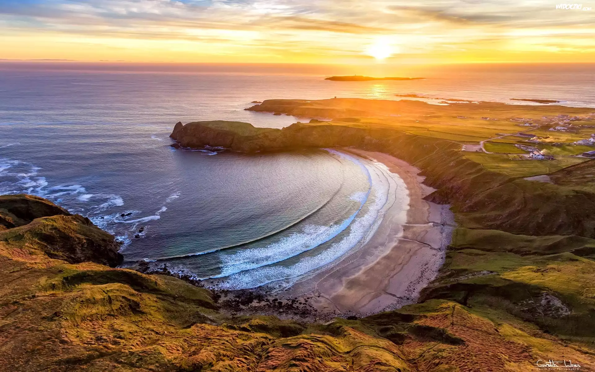 Morze, Wybrzeże, Zachód słońca, Zatoka, Plaża, Silver Strand Horseshoe Beach, Malin Beg, Hrabstwo Donegal, Irlandia |