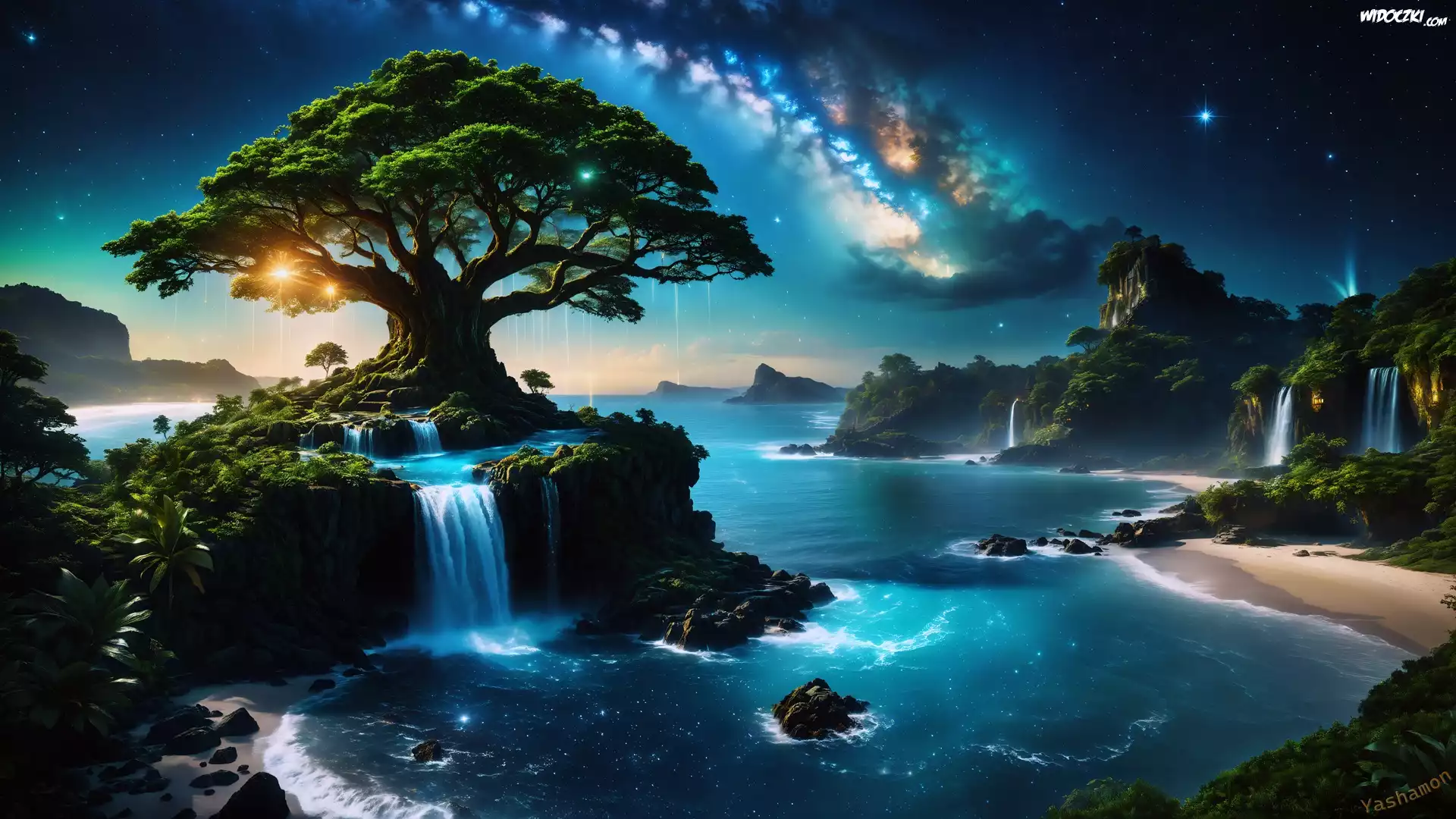 Morze, Skały, Drzewo, Wodospady, Noc, Gwiazdy, Droga Mleczna, Fantasy