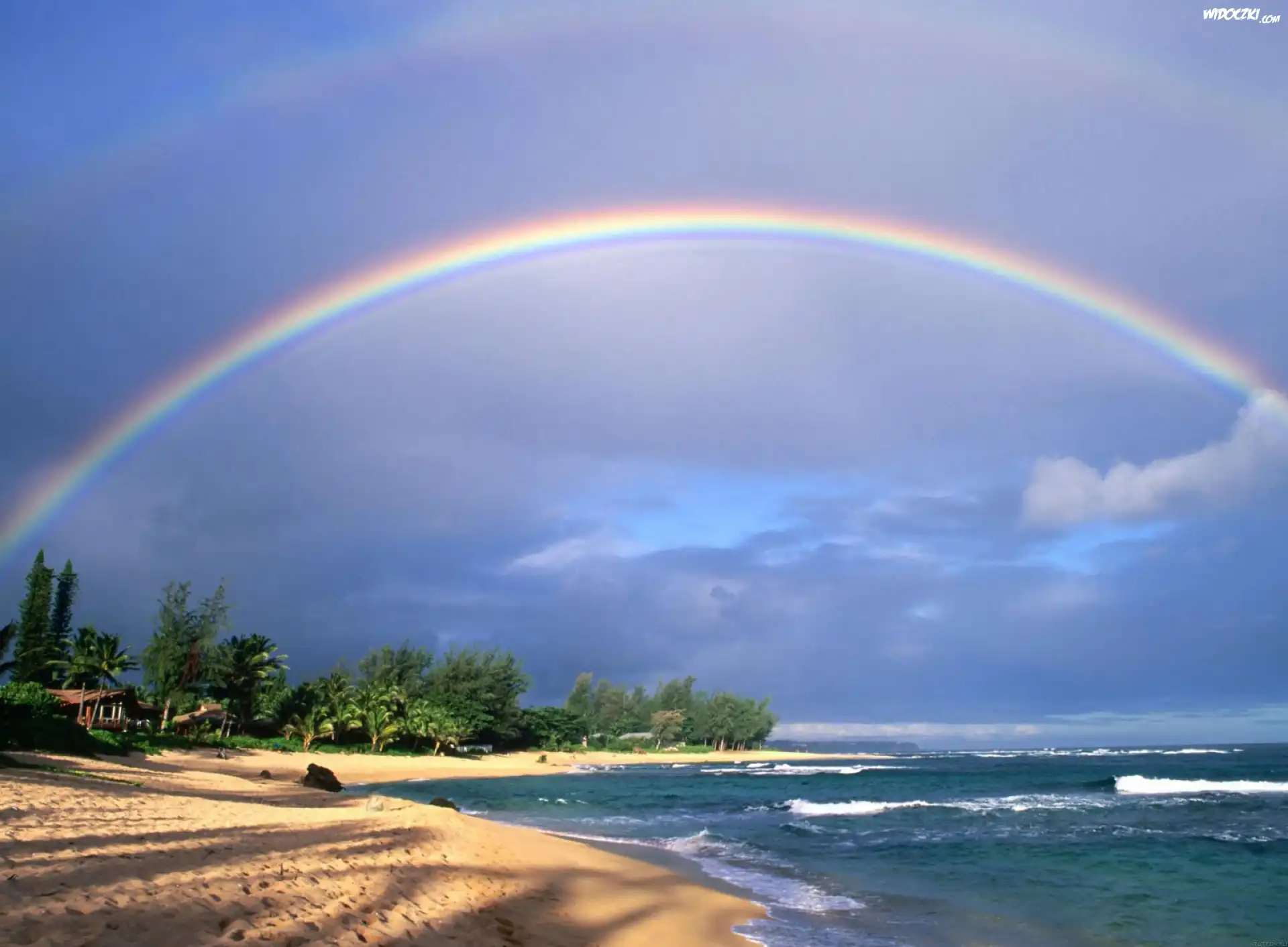 Zdjęcia, Morze, Wybrzeże, Plaża, Fale, Drzewa, Tęcza