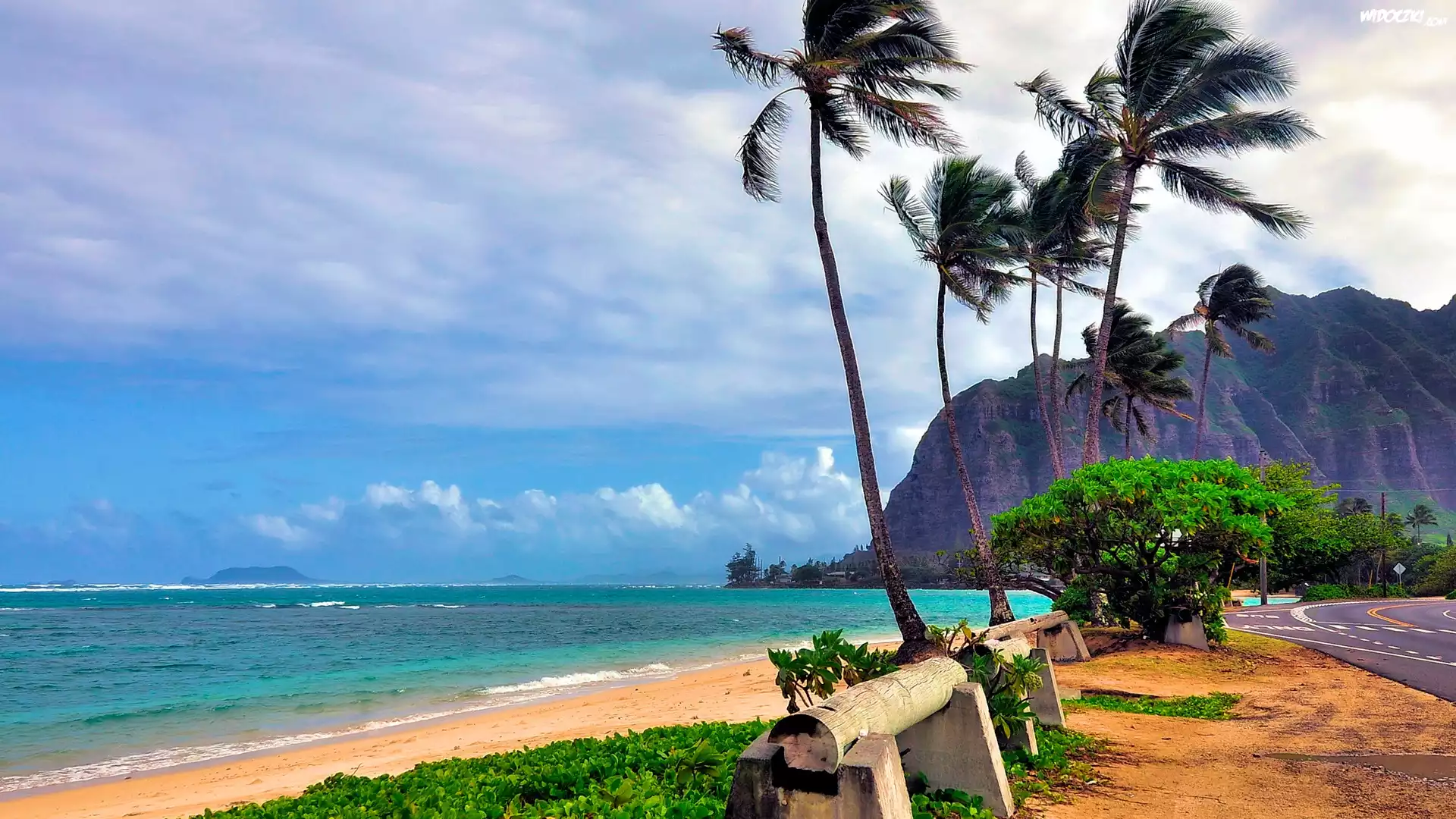 Zdjęcia, Morze, Plaża, Skały, Droga, Drzewa, Palmy