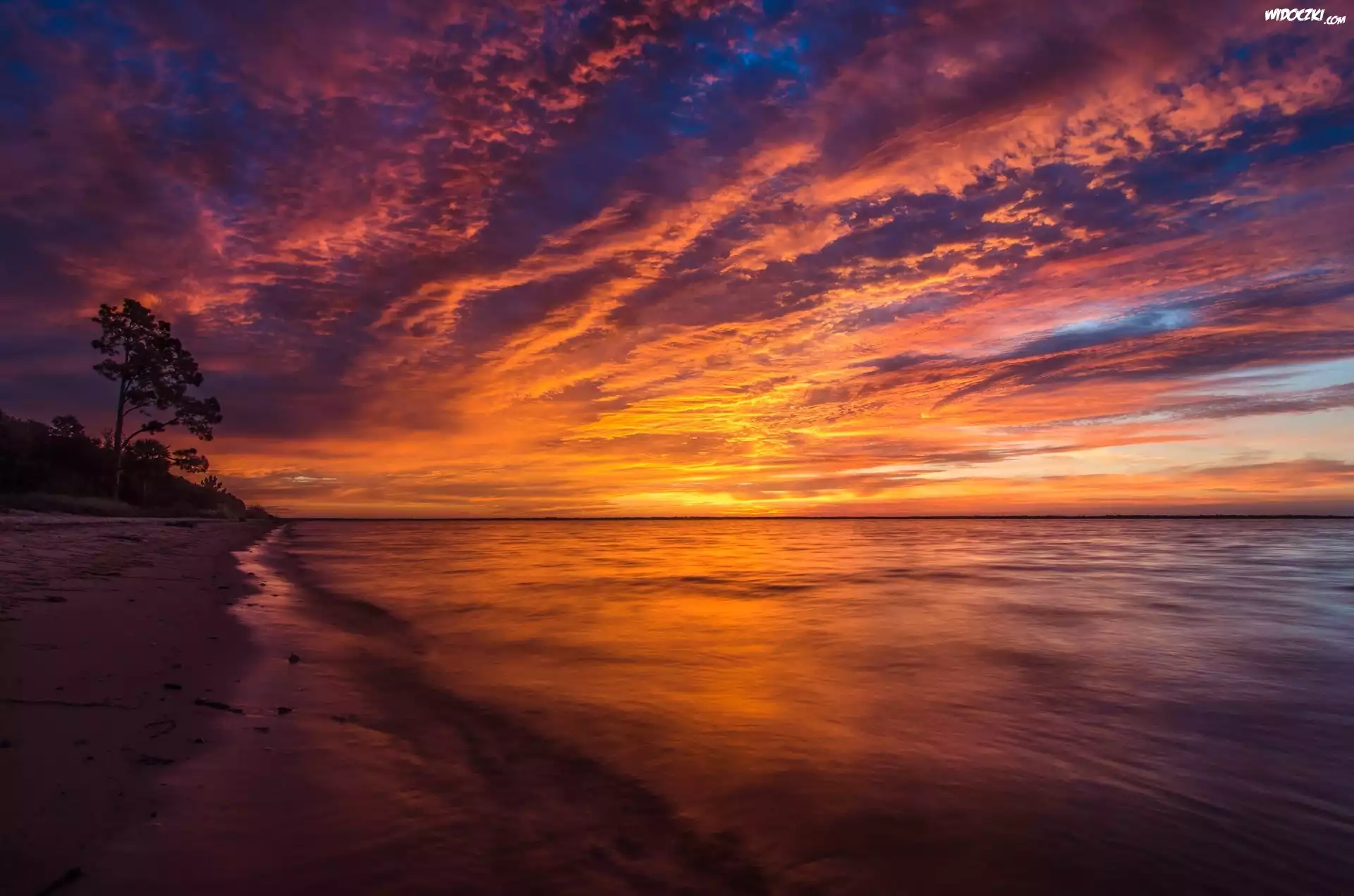 Morze, Zachód słońca, Plaża, Drzewa, Chmury