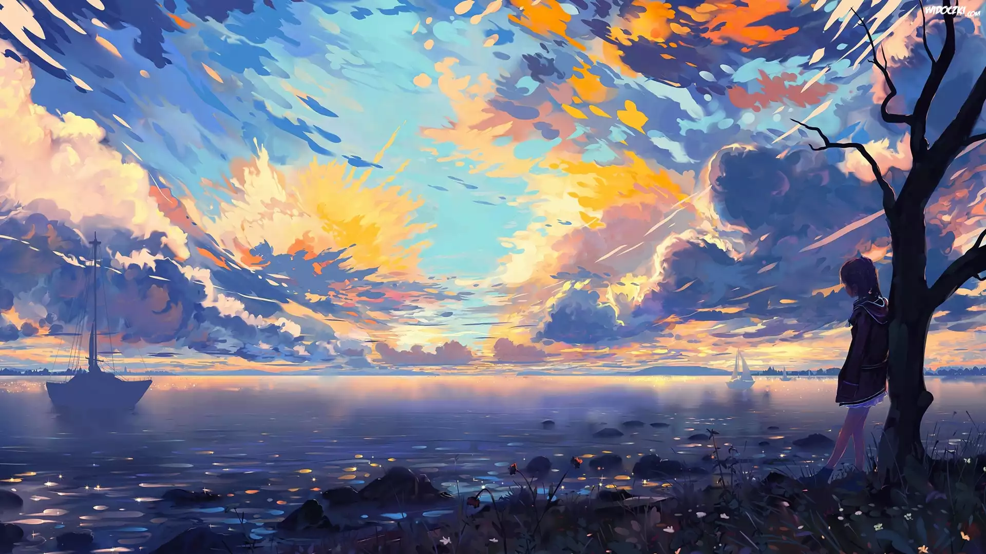 Morze, Chmury, Żaglówki, Dziewczyna Paintography