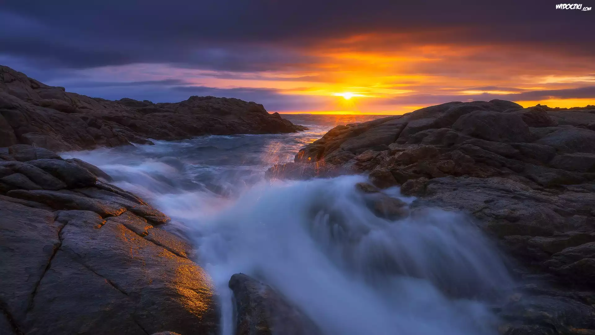 Zdjęcia, Zachód słońca, Chmury, Morze, Skały, Fale