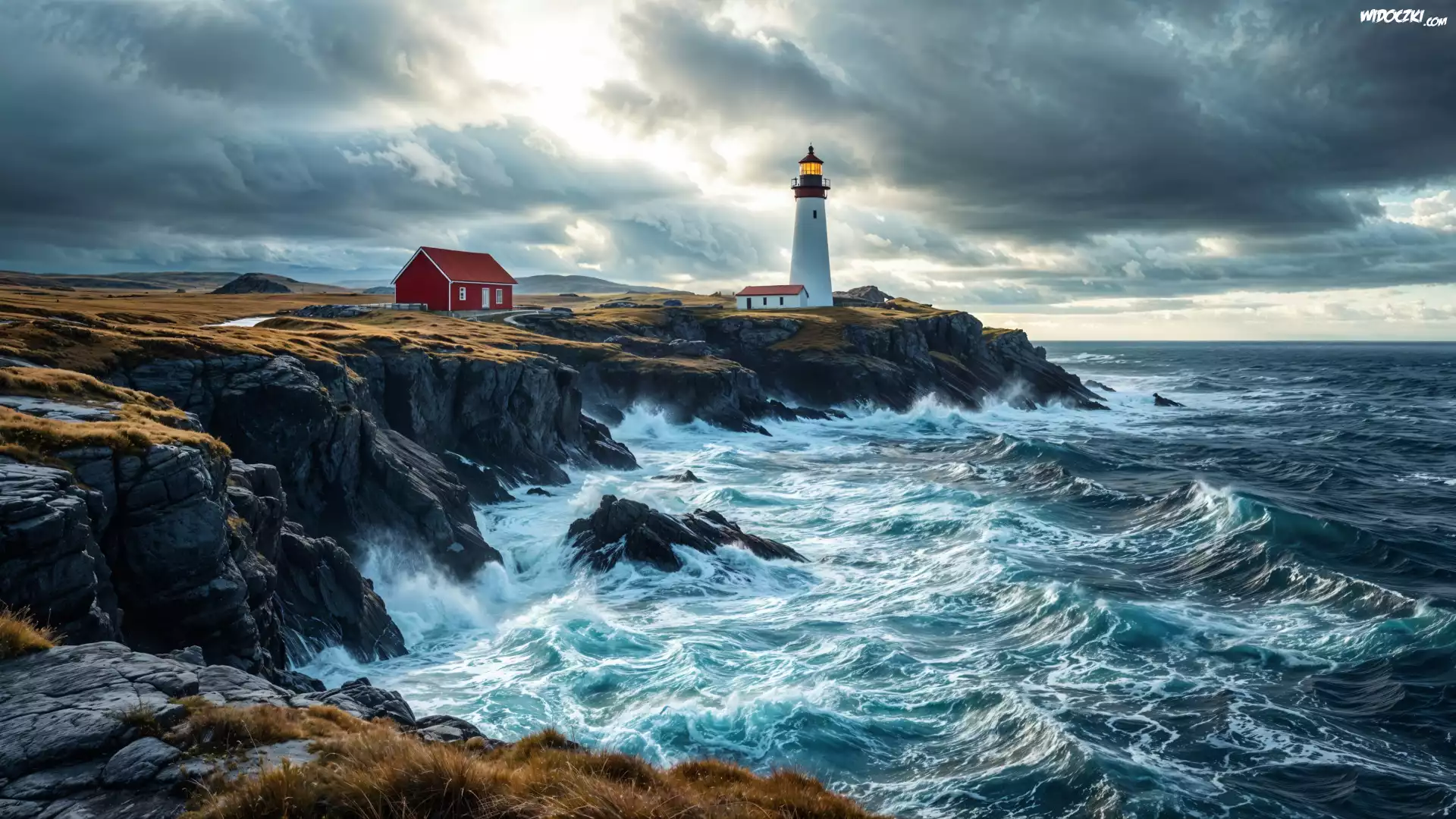 Zdjęcia, Morze, Skały, Brzeg, Latarnia morska, Dom, Fale, Niebo, Chmury