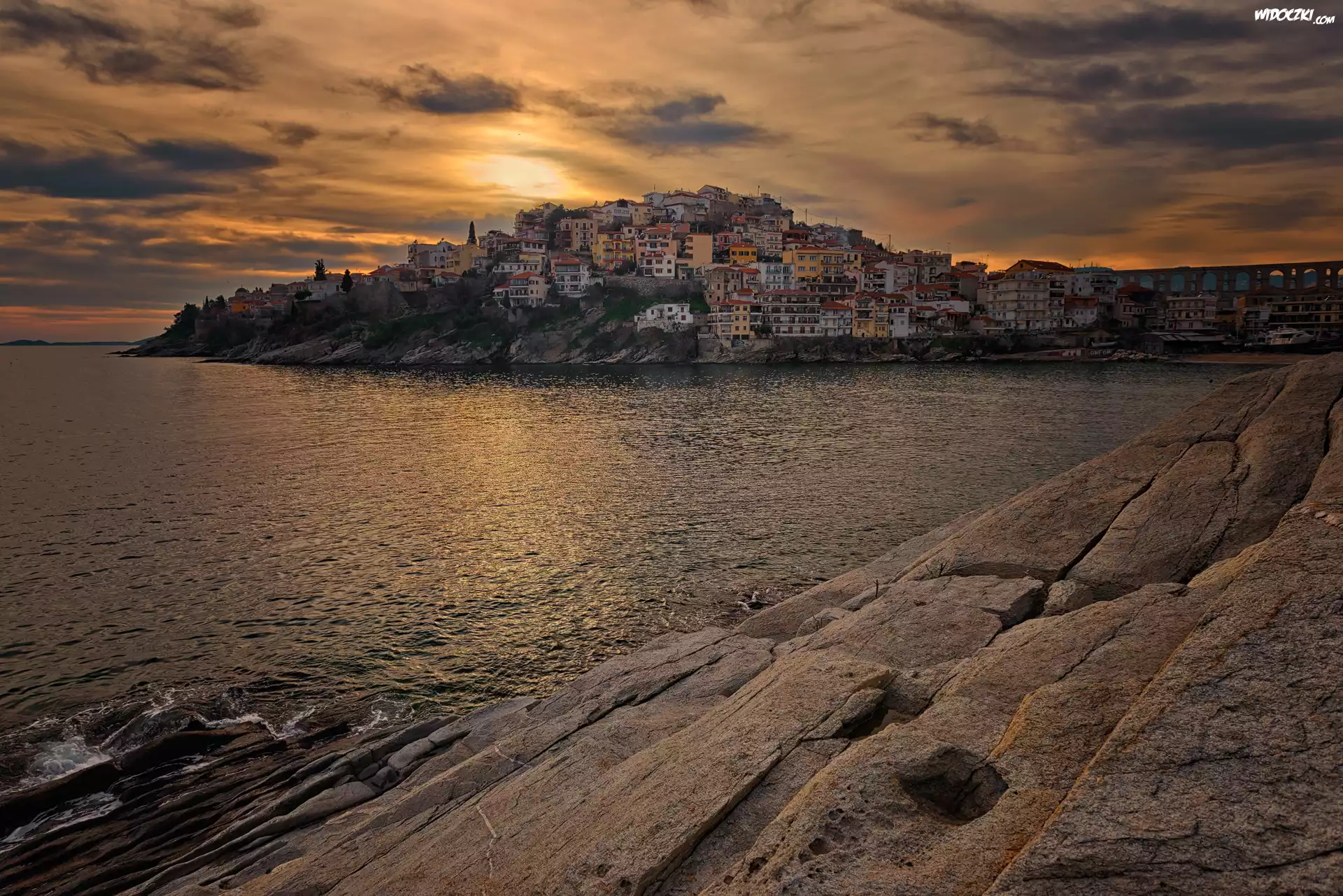 Domy, Morze, Wschód słońca, Skały, Miejscowość Kawala, Grecja