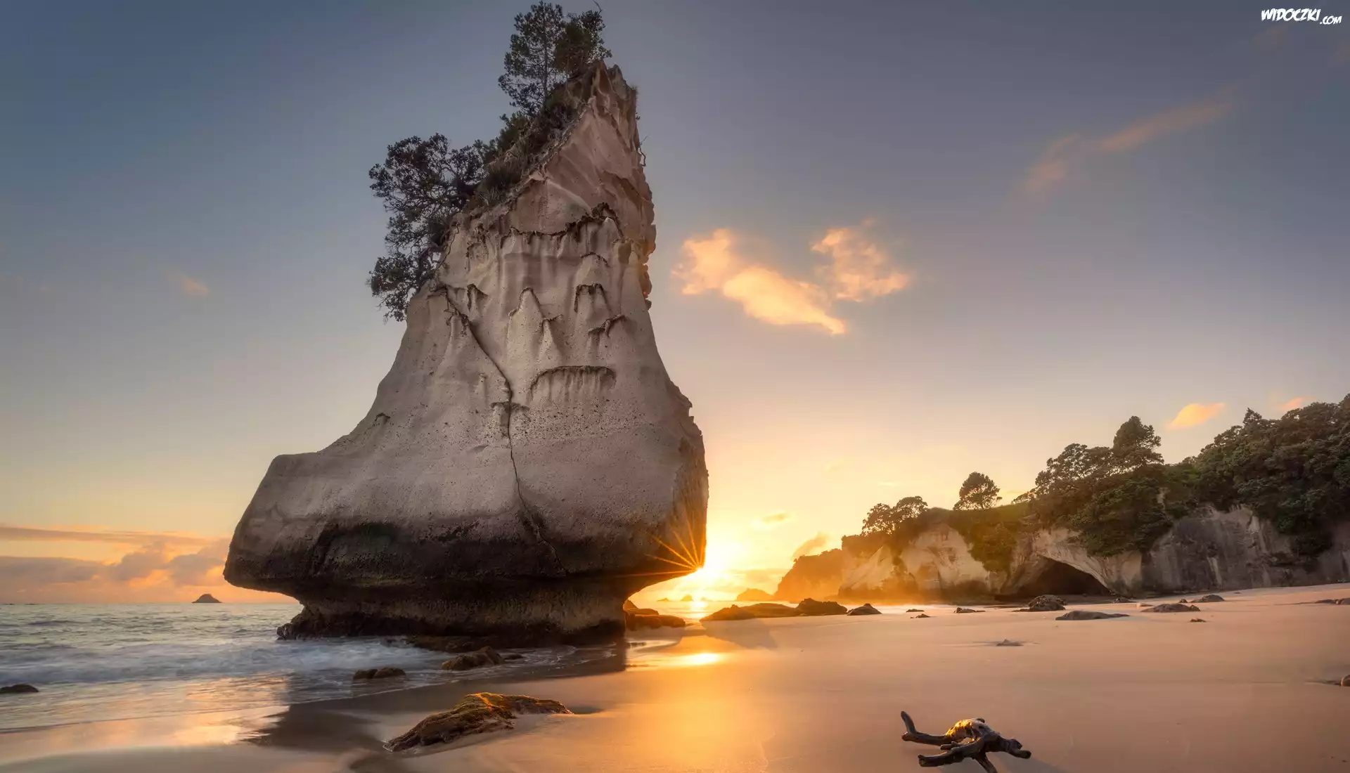 Zdjęcia, Morze, Skała, Te Hoho Rock, Plaża, Drzewa, Wschód słońca, Półwysep Coromandel, Nowa Zelandia
