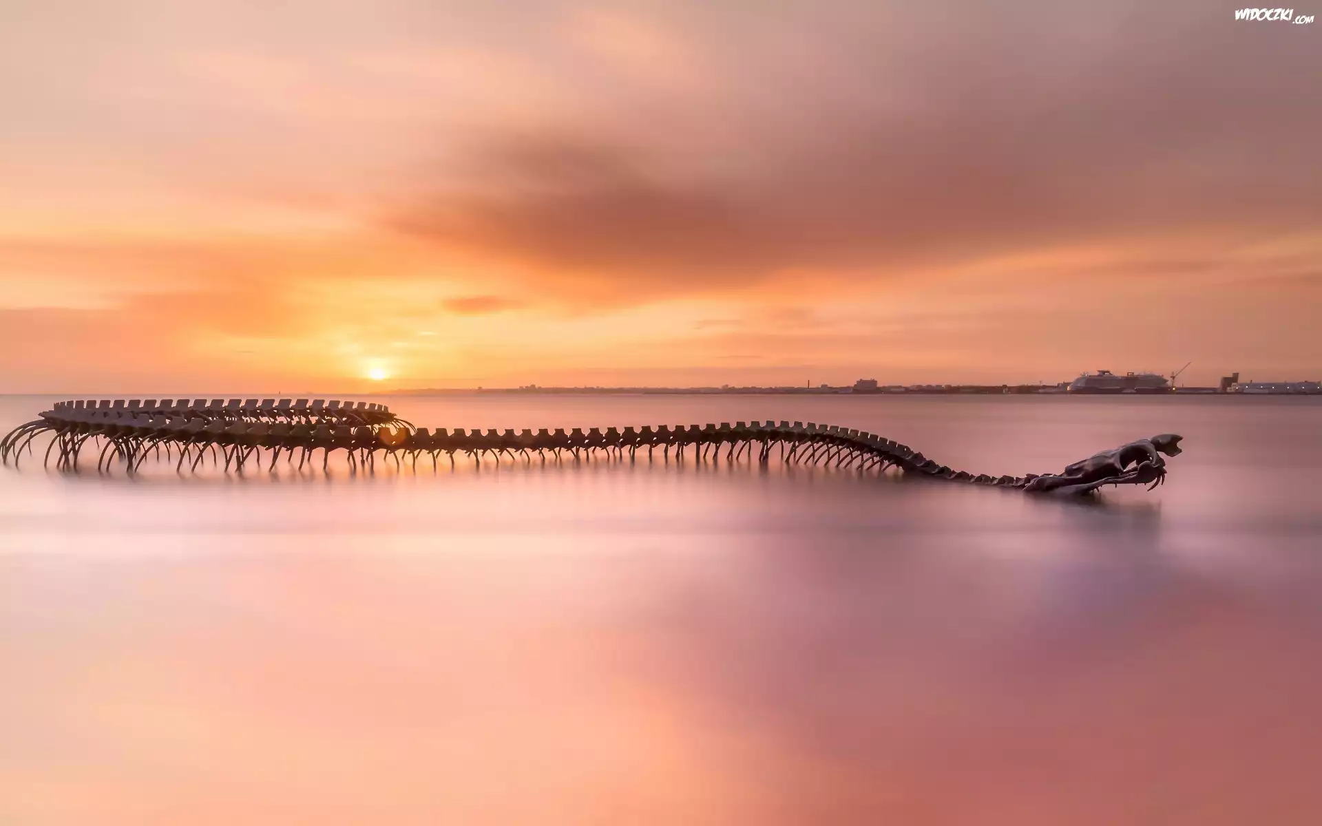 Morze, Wschód słońca, Szkielet, Wąż, Rzeźba, Serpent d ocean, Huang Yong Ping, Saint Brevin les Pins, Francja |