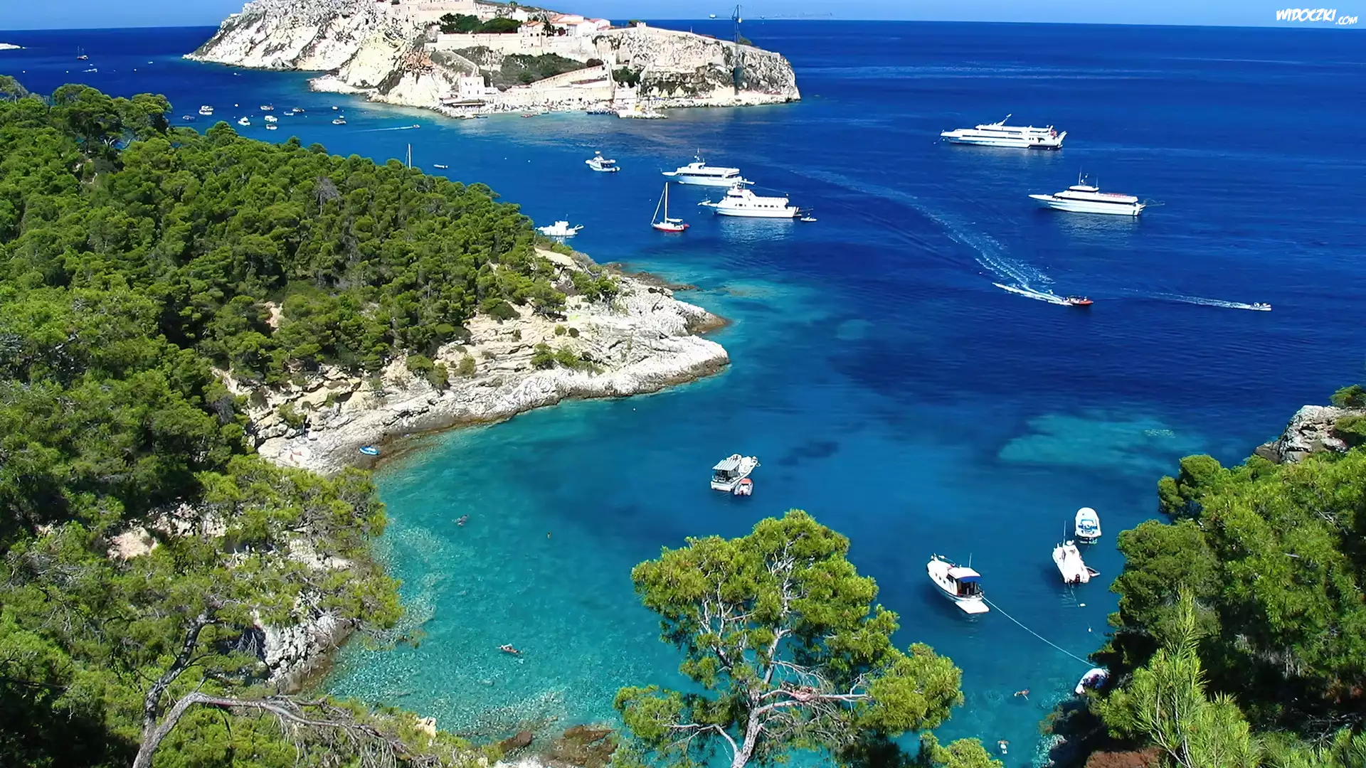 Zdjęcia, Morze, Wyspa, Statki, Jachty, Drzewa