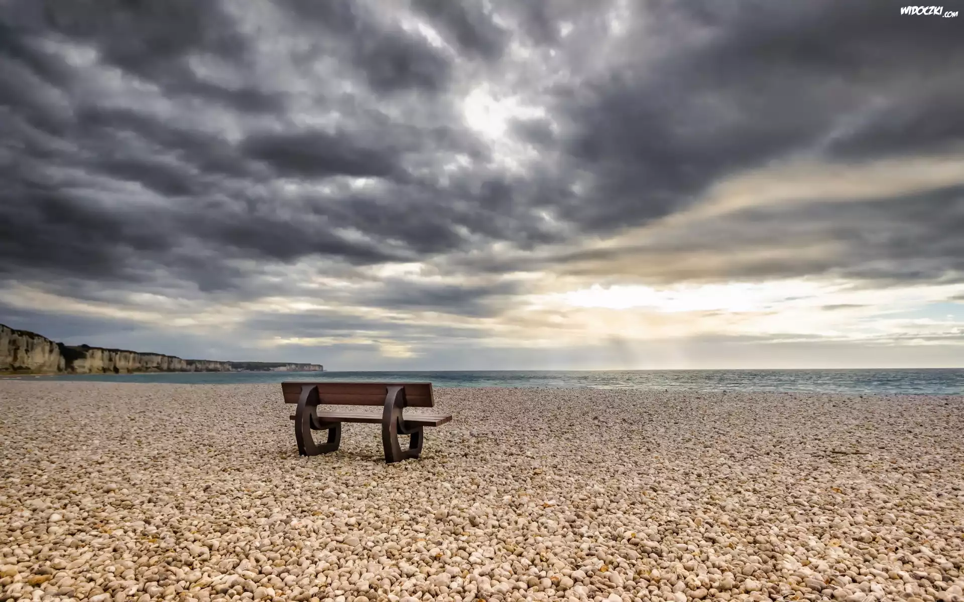Zdjęcia, Ławka, Kamienie, Morze, Chmury