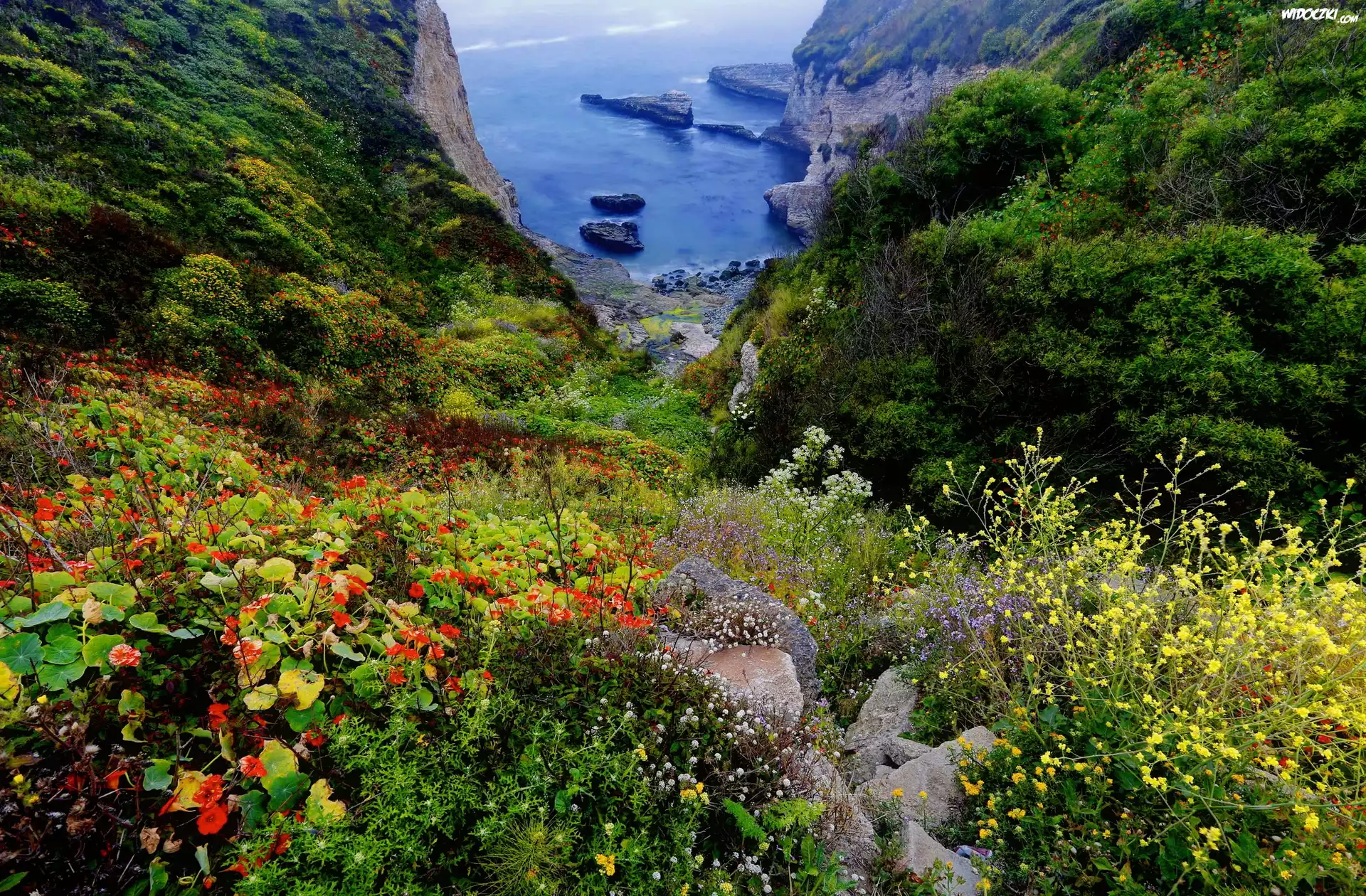Morze, Wybrzeże, Las, Kamienie, Kwiaty