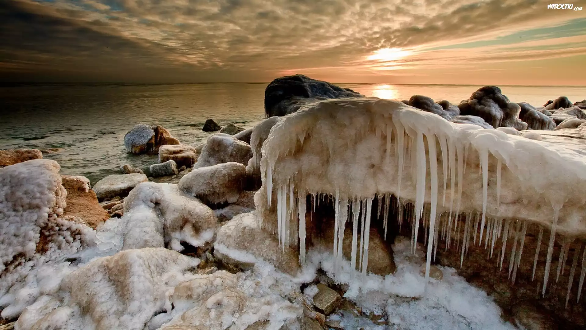 Zdjęcia, Morze, Plaża, Oblodzone, Kamienie, Zima