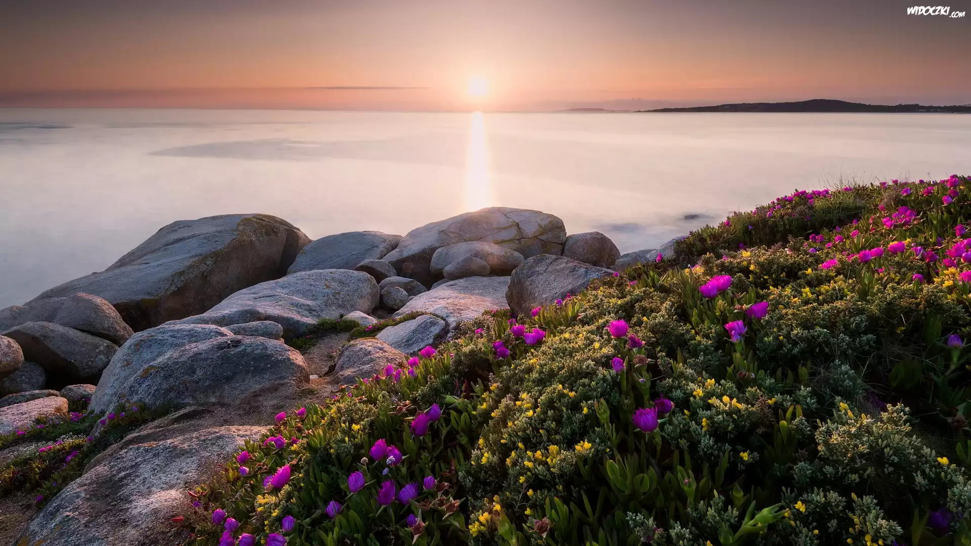 Zdjęcia, Morze, Zachód słońca, Brzeg, Kamienie, Kwiaty