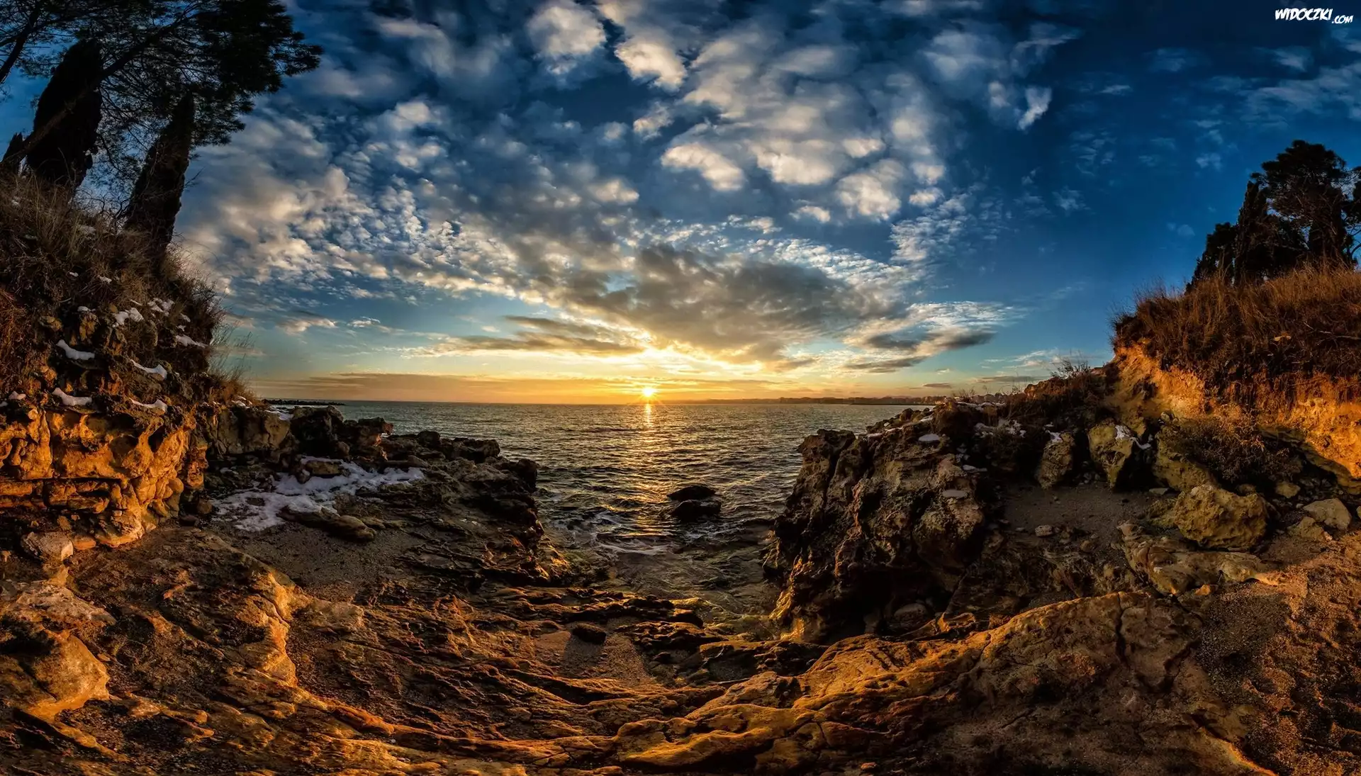 Zdjęcia, Morze, Zachód słońca, Chmury, Kamienie, Drzewa
