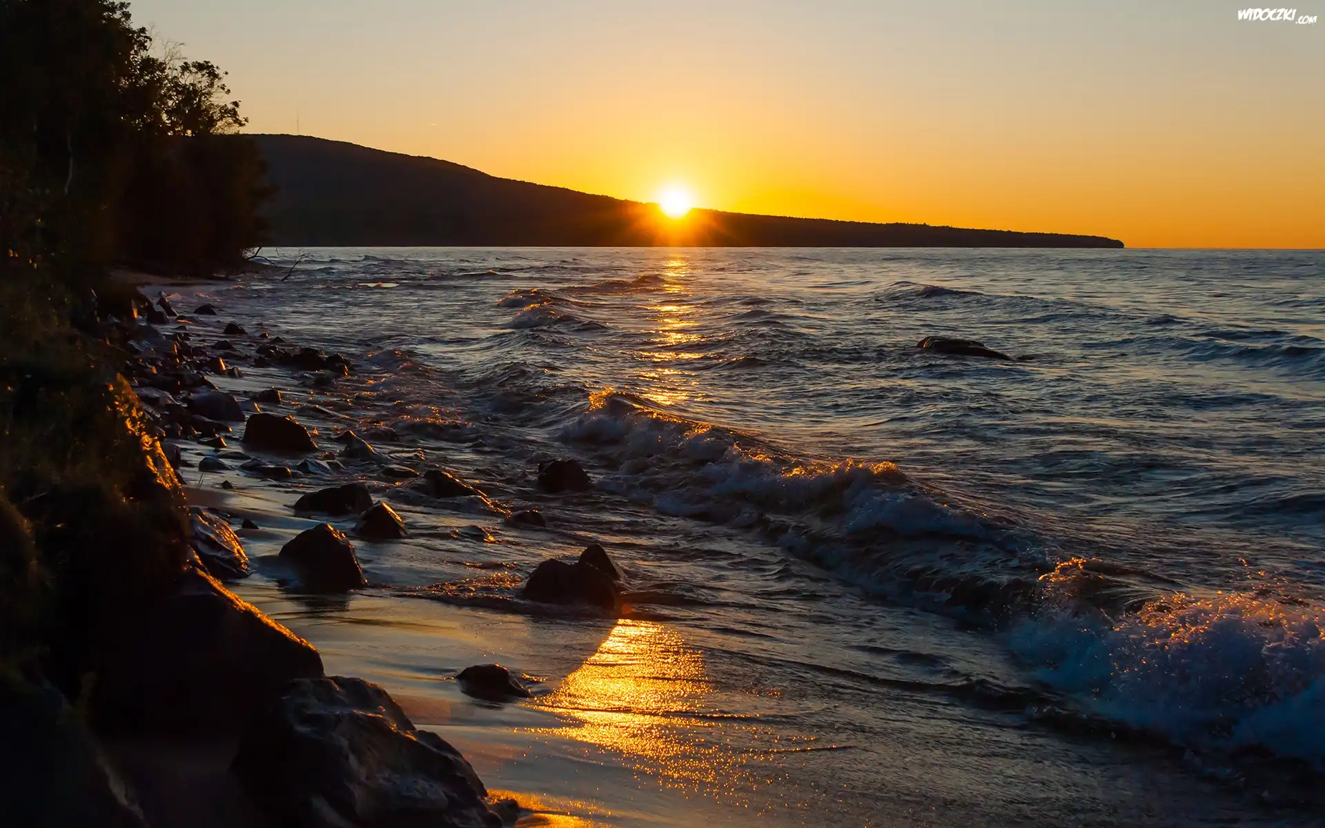 Zdjęcia, Morze, Zachód słońca, Kamienie, Drzewa