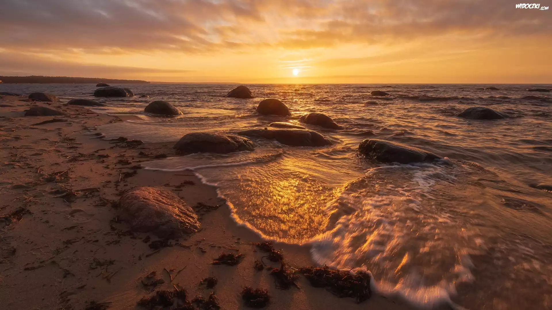 Zdjęcia, Morze, Zachód słońca, Kamienie, Piasek