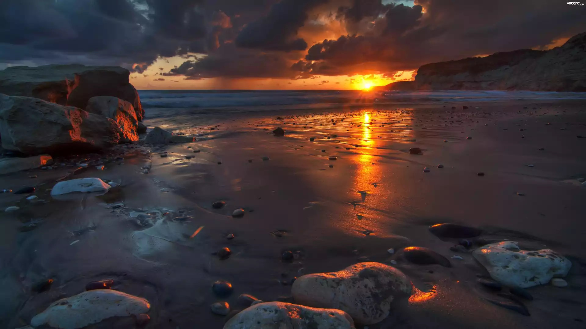 Morze, Plaża, Zachód, Słońca, Kamienie, Chmury