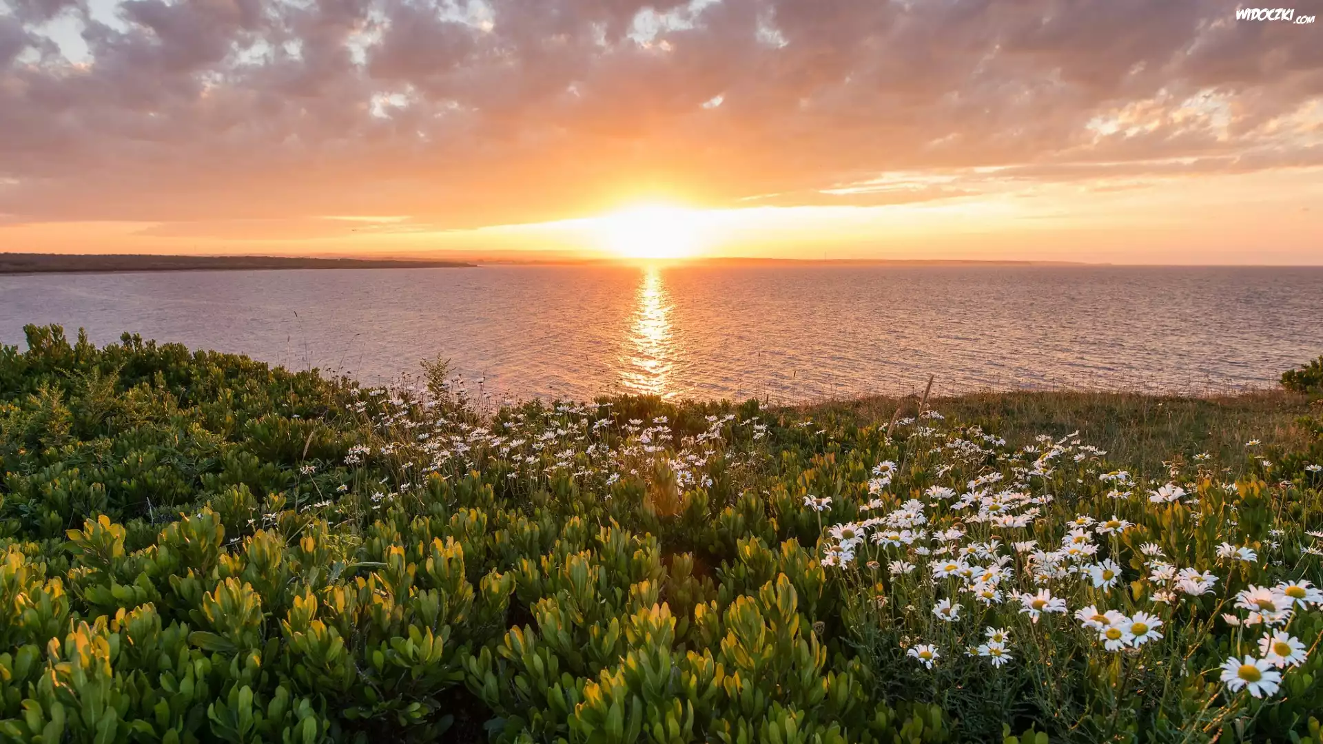 Kanada, Nowa Szkocja, Zachód słońca, Morze - Ocean Atlantycki, Brzeg, Kwiaty, Złocień, Rośliny |