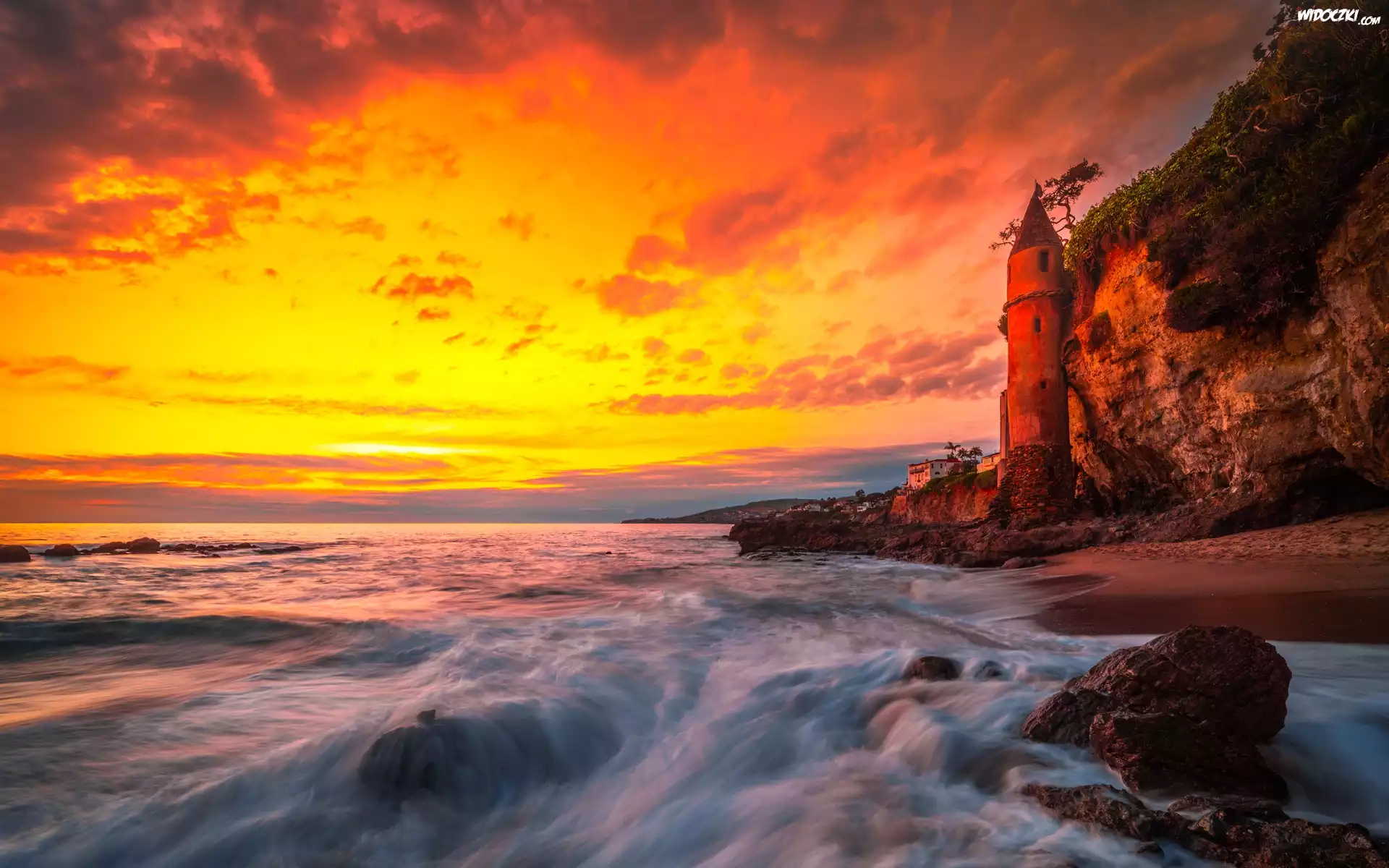 Morze, Victoria Beach, Klif, Wieża, La Tour, Skały, Zachód słońca, Kalifornia, Stany Zjednoczone |