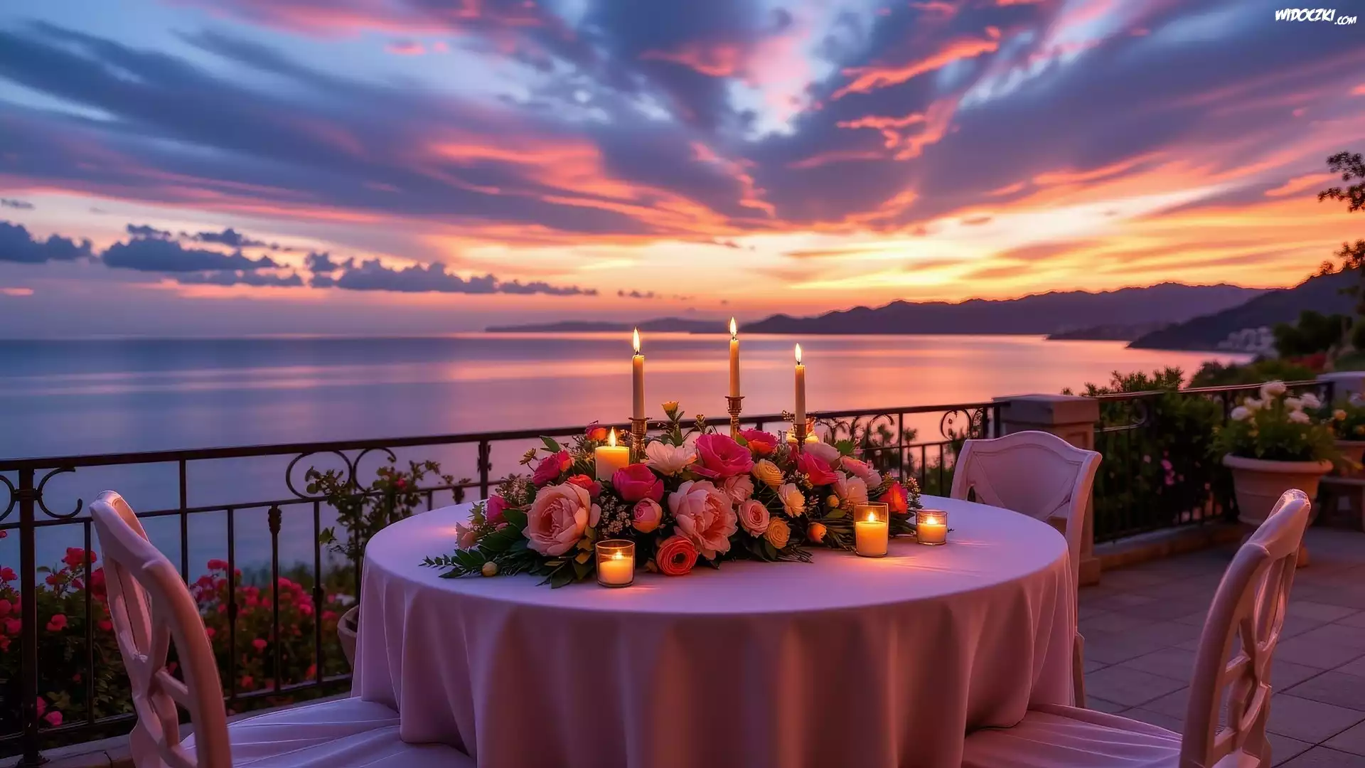 Zdjęcia, Morze, Taras, Stół, Krzesła, Kolorowe, Kwiaty, Róże, Świece, Kolorowe, Niebo