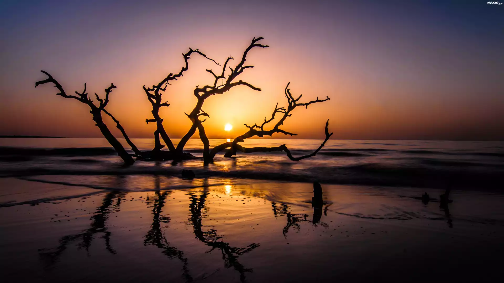 Morze, Zachód, Słońca, Korzenie, Drzewo