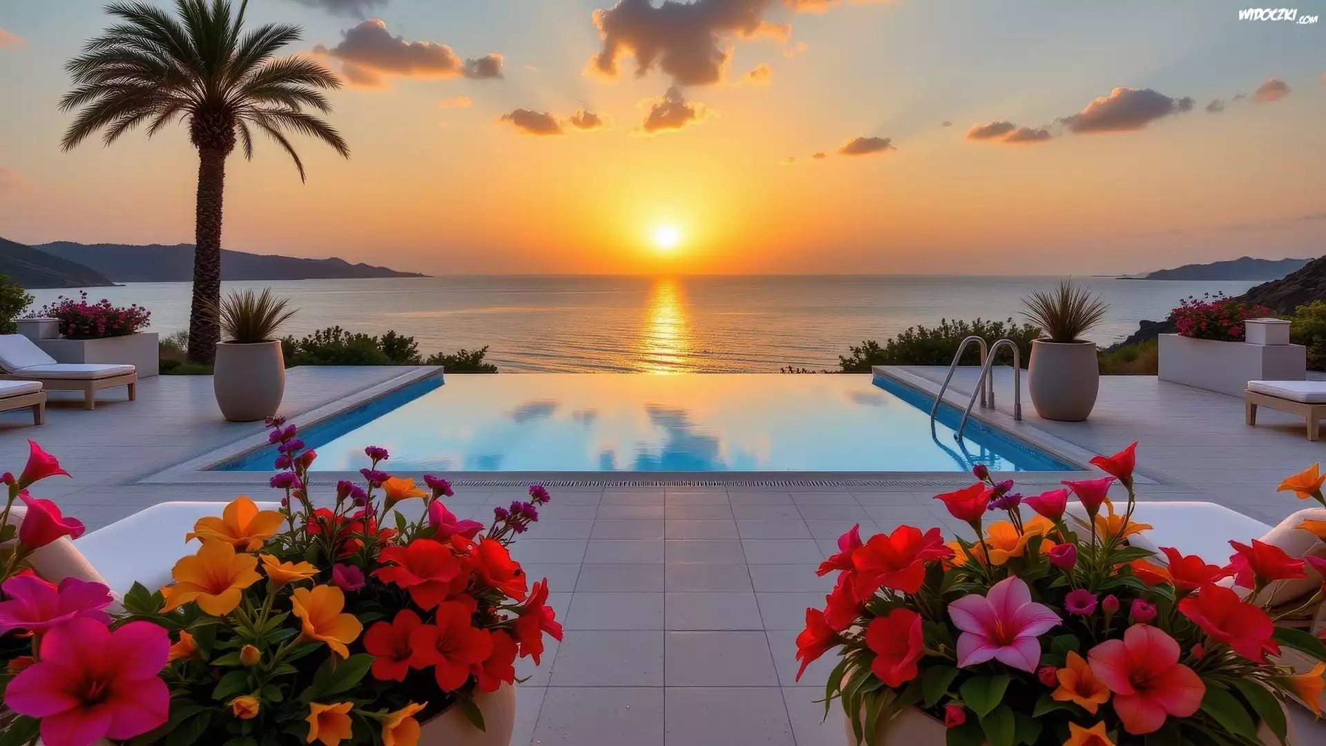 Zdjęcia, Morze, Zachód słońca, Basen, Palma, Kolorowe, Kwiaty, Donice, Leżaki