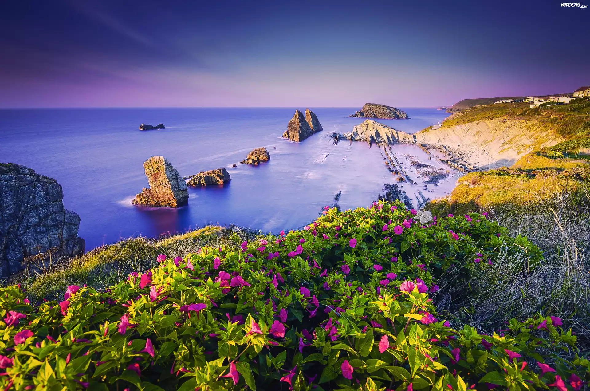 Zdjęcia, Morze, Skały, Różowe, Kwiaty, Wybrzeże