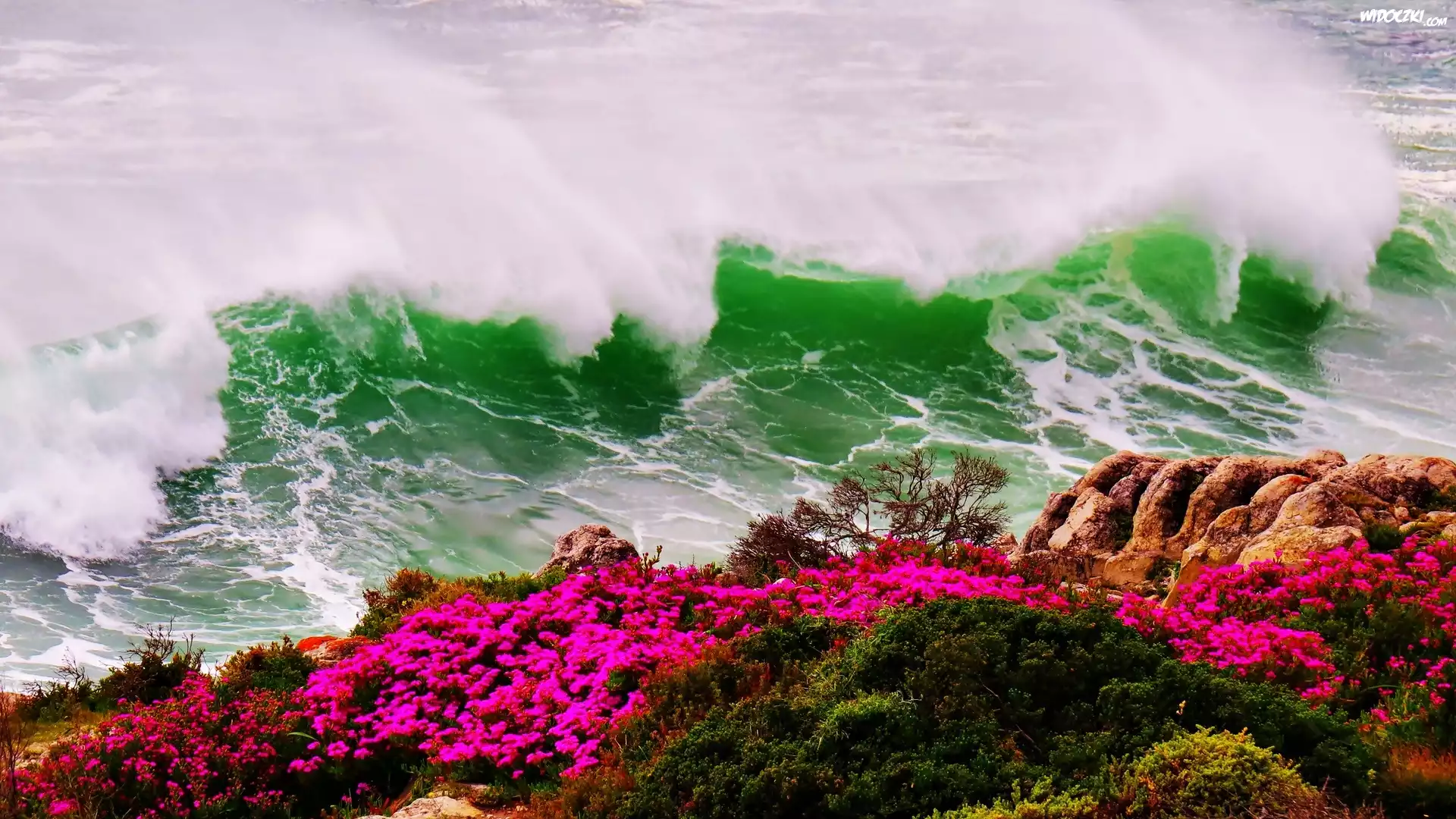 Morze, Fale, Skały, Kwiaty, Brzeg