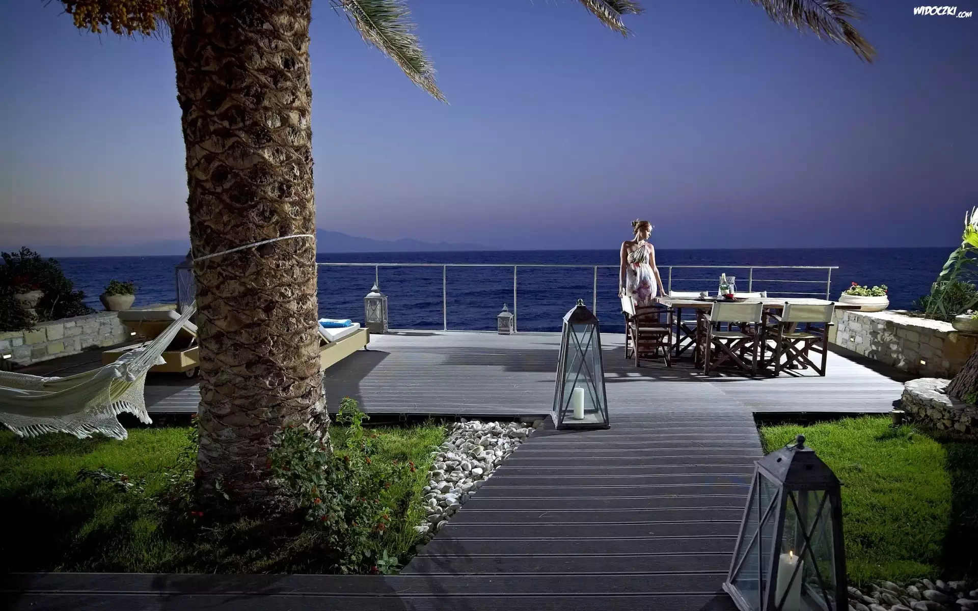 Morze, Molo, Kobieta, Palma, Lampy, Wieczór