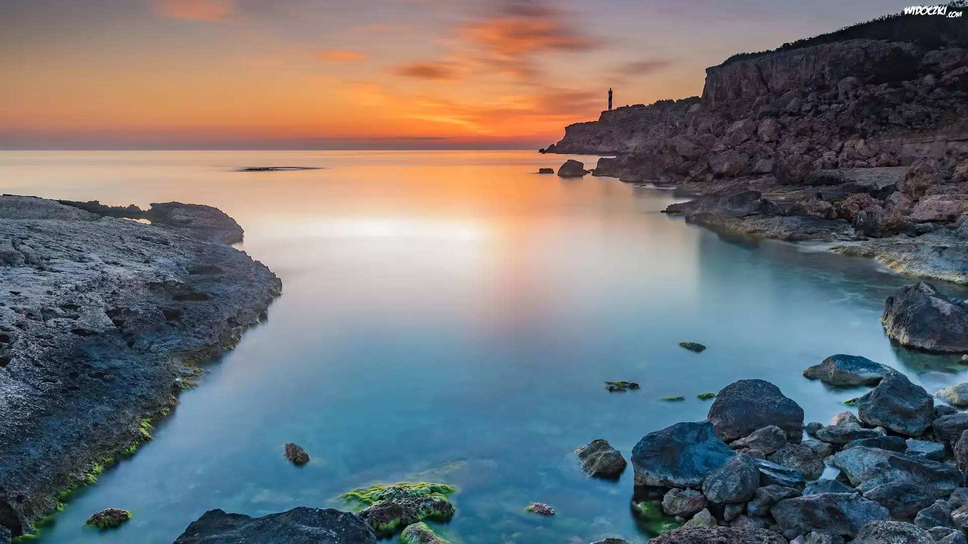 Morze Śródziemne, Skały, Latarnia morska, Punta des Moscarter, Wschód słońca, Portinatx, Ibiza, Hiszpania |